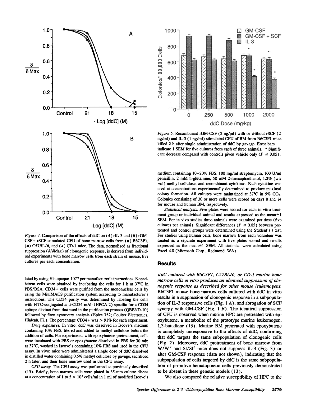The nucleoside analogue, 2',3'-dideoxycytidine (ddC), is a potent inhibitor of HIV replication, and AIDS patients receiving ddC experience clinical improvement without significant hematologic toxicity. Repeated ddC administration (1,000 mg/kg per day) for 13 wk produces an increased incidence of thymic lymphoma in B6C3F1 mice. Previous studies reveal a common link between chemically induced and genetically associated models of mouse thymic lymphoma that involves a defect in a subpopulation of primitive hematopoietic progenitor cells. This defect is characterized by suppression of a subpopulation of IL-3-responsive cells and ablation of stem cell factor synergy with GM-CSF. The present study was undertaken to ascertain whether ddC produces the same pattern of bone marrow toxicity in mice, and whether this effect is observed in rat and human bone marrow. ddC exposure in vivo and in vitro produced a select suppression of murine CFU identical to that previously described for other models of mouse thymic lymphoma. In contrast, this selective CFU suppression was not observed in rat and human bone marrow or in CD34+ cells. These studies suggest that the mouse may not be a good predictive model for ddC hematotoxicity in humans and that susceptibility to the development of thymic lymphoma may be unique to the mouse.