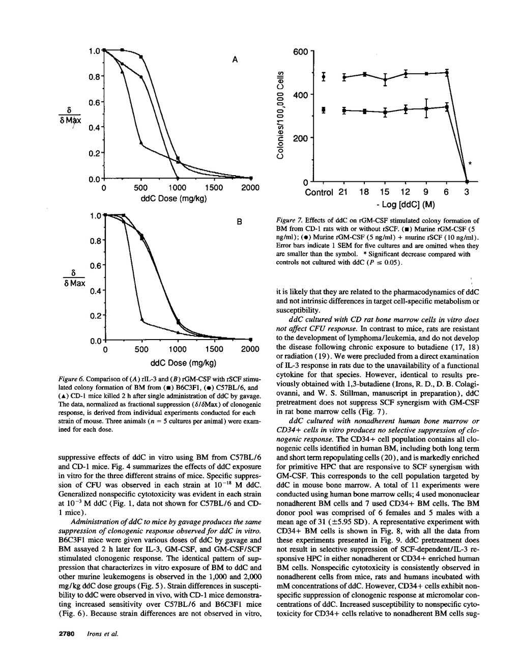 The nucleoside analogue, 2',3'-dideoxycytidine (ddC), is a potent inhibitor of HIV replication, and AIDS patients receiving ddC experience clinical improvement without significant hematologic toxicity. Repeated ddC administration (1,000 mg/kg per day) for 13 wk produces an increased incidence of thymic lymphoma in B6C3F1 mice. Previous studies reveal a common link between chemically induced and genetically associated models of mouse thymic lymphoma that involves a defect in a subpopulation of primitive hematopoietic progenitor cells. This defect is characterized by suppression of a subpopulation of IL-3-responsive cells and ablation of stem cell factor synergy with GM-CSF. The present study was undertaken to ascertain whether ddC produces the same pattern of bone marrow toxicity in mice, and whether this effect is observed in rat and human bone marrow. ddC exposure in vivo and in vitro produced a select suppression of murine CFU identical to that previously described for other models of mouse thymic lymphoma. In contrast, this selective CFU suppression was not observed in rat and human bone marrow or in CD34+ cells. These studies suggest that the mouse may not be a good predictive model for ddC hematotoxicity in humans and that susceptibility to the development of thymic lymphoma may be unique to the mouse.