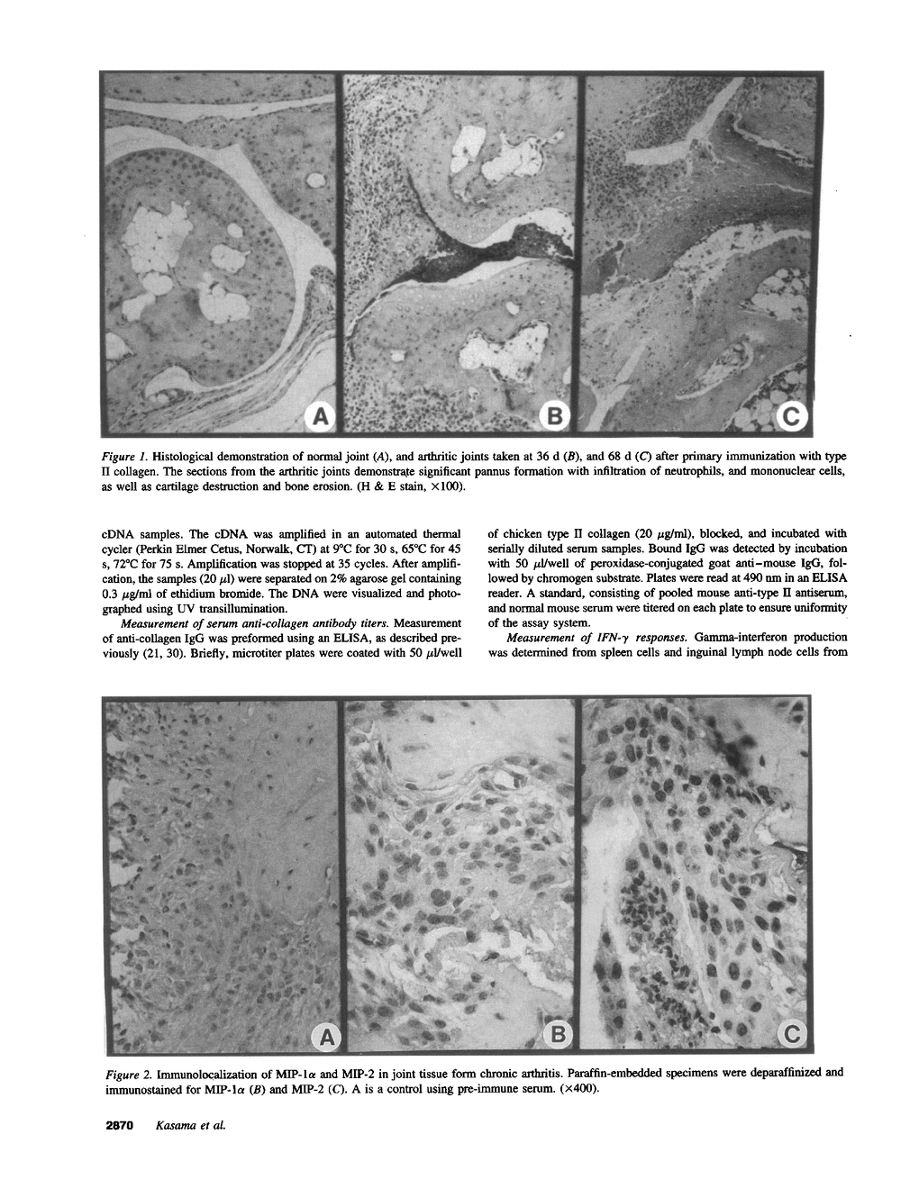 In the enclosed study we have examined the expression and contribution of specific chemokines, macrophage inflammatory protein 1 alpha (MIP-1 alpha) and macrophage inflammatory protein 2 (MIP-2), and interleukin 10 (IL-10) during the evolution of type II collagen-induced arthritis (CIA). Detectable levels of chemotactic cytokine protein for MIP-1 alpha and MIP-2 were first observed between days 32 and 36, after initial type II collagen challenge, while increases in IL-10 were found between days 36 and 44. CIA mice passively immunized with antibodies directed against either MIP-1 alpha or MIP-2 demonstrated a delay in the onset of arthritis and a reduction of the severity of arthritis. On the contrary, CIA mice receiving neutralizing anti-IL-10 antibodies demonstrated an acceleration of the onset and an increase in the severity of arthritis. Interestingly, anti-IL-10 treatment increased the expression of MIP-1 alpha and MIP-2, as well as increased myeloperoxidase (MPO) activity and leukocyte infiltration in the inflamed joints. These data suggest that MIP-1 alpha and MIP-2 play a crucial role in the initiation and maintenance, while IL-10 appears to play a regulatory role during the development of experimental arthritis.