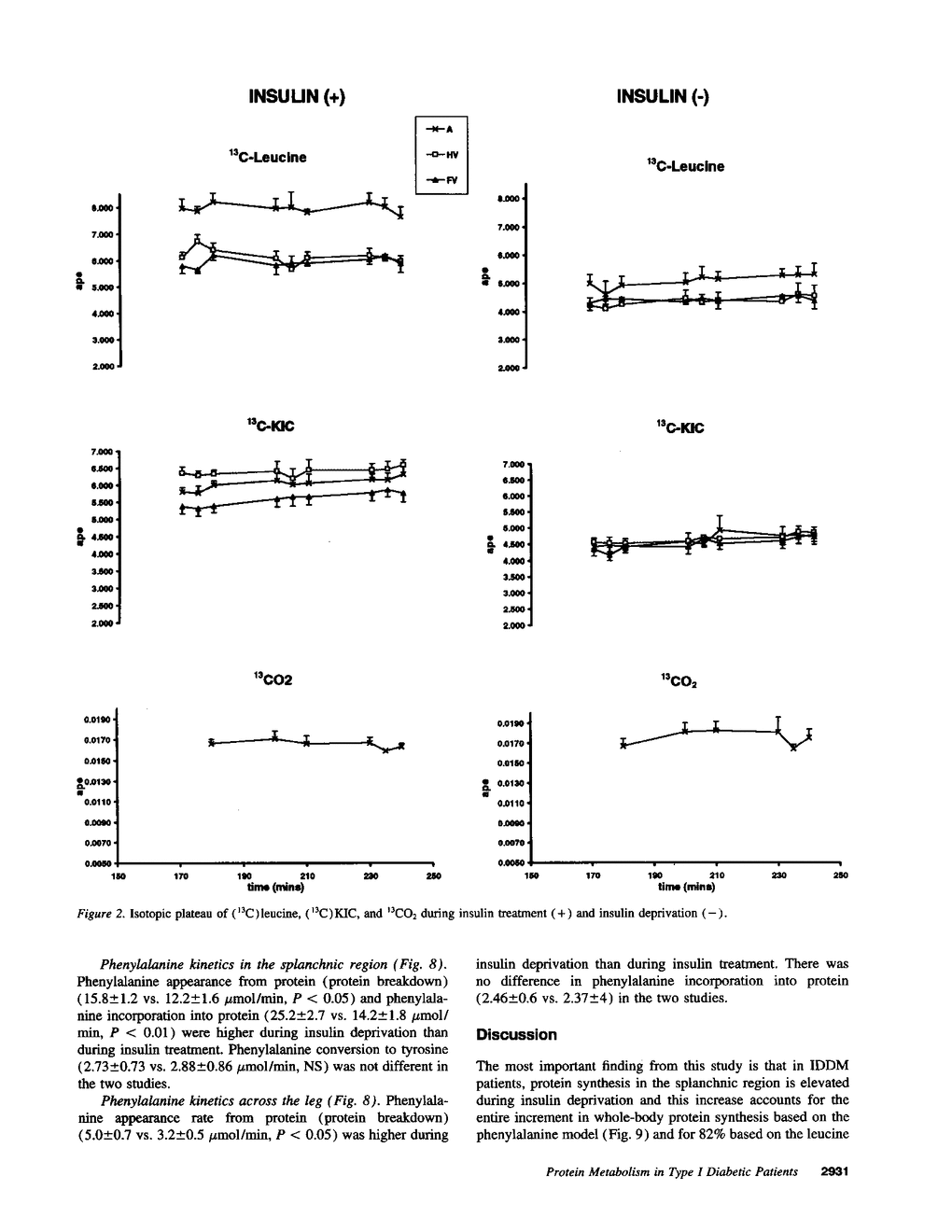 To elucidate the mechanism of insulin's anticatabolic effect in humans, protein dynamics were evaluated in the whole-body, splanchnic, and leg tissues in six C-peptide-negative type I diabetic male patients in the insulin-deprived and insulin-treated states using two separate amino acid models (leucine and phenylalanine). L-(1-13C,15N)leucine, L-(ring-2H5)phenylalanine, and L-(ring-2H2) tyrosine were infused intravenously, and isotopic enrichments of [1-13C,15N]-leucine, (13C)leucine, (13C)ketoisocaproate, (2H5)phenylalanine, [2H4]tyrosine, (2H2)tyrosine, and 13CO2 were measured in arterial, hepatic vein, and femoral vein samples. Whole-body leucine flux, phenylalanine flux, and tyrosine flux were decreased (< 0.01) by insulin treatment, indicating an inhibition of protein breakdown. Moreover, insulin decreased (< 0.05) the rates of leucine oxidation and leucine transamination (P < 0.01), but the percent rate of ketoisocaproate oxidation was increased by insulin (P < 0.01). Insulin also reduced (< 0.01) whole-body protein synthesis estimated from both the leucine model (nonoxidative leucine disposal) and the phenylalanine model (disposal of phenylalanine not accounted by its conversion to tyrosine). Regional studies demonstrated that changes in whole body protein breakdown are accounted for by changes in both splanchnic and leg tissues. The changes in whole-body protein synthesis were not associated with changes in skeletal muscle (leg) protein synthesis but could be accounted for by the splanchnic region. We conclude that though insulin decreases whole-body protein breakdown in patients with type I diabetes by inhibition of protein breakdown in splanchnic and leg tissues, it selectively decreases protein synthesis in splanchnic tissues, which accounted for the observed decrease in whole-body protein synthesis. Insulin also augmented anabolism by decreasing leucine transamination.