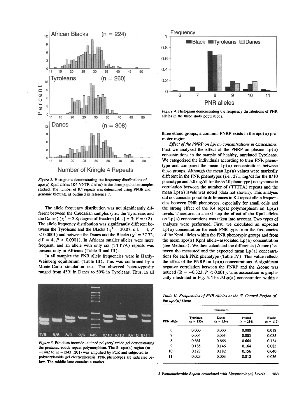 The enormous interindividual variation in the plasma concentrations of the atherogenic lipoprotein(a) [Lp(a)] is almost entirely controlled by the apo(a) locus on chromosome 6q26-q27. A variable number of transcribed kringle4 repeats (K4-VNTR) in the gene explains a large fraction of this variation, whereas the rest is presently unexplained. We here have analyzed the effect of the K4-VNTR and of a pentanucleotide repeat polymorphism (TTTTA)n (n = 6-11) in the 5' control region of the apo(a) gene on plasma Lp(a) levels in unrelated healthy Tyroleans (n = 130), Danes (n = 154), and Black South Africans (n = 112). The K4-VNTR had a significant effect on plasma Lp(a) levels in Caucasians and explained 41 and 45% of the variation in Lp(a) plasma concentration in Tyroleans and Danes, respectively. Both, the pentanucleotide repeat (PNR) allele frequencies and their effects on Lp(a) concentrations were heterogeneous among populations. A significant negative correlation between the number of pentanucleotide repeats and the plasma Lp(a) concentration was observed in Tyroleans and Danes. The effect of the 5' PNRP on plasma Lp(a) concentrations was independent from the K4-VNTR and explained from 10 to 14% of the variation in Lp(a) concentrations in Caucasians. No significant effect of the PNRP was present in Black Africans. This suggests allelic association between PNR alleles and sequences affecting Lp(a) levels in Caucasians. Thus, in Caucasians but not in Blacks, concentrations of the atherogenic Lp(a) particle are strongly associated with two repeat polymorphisms in the apo(a) gene.