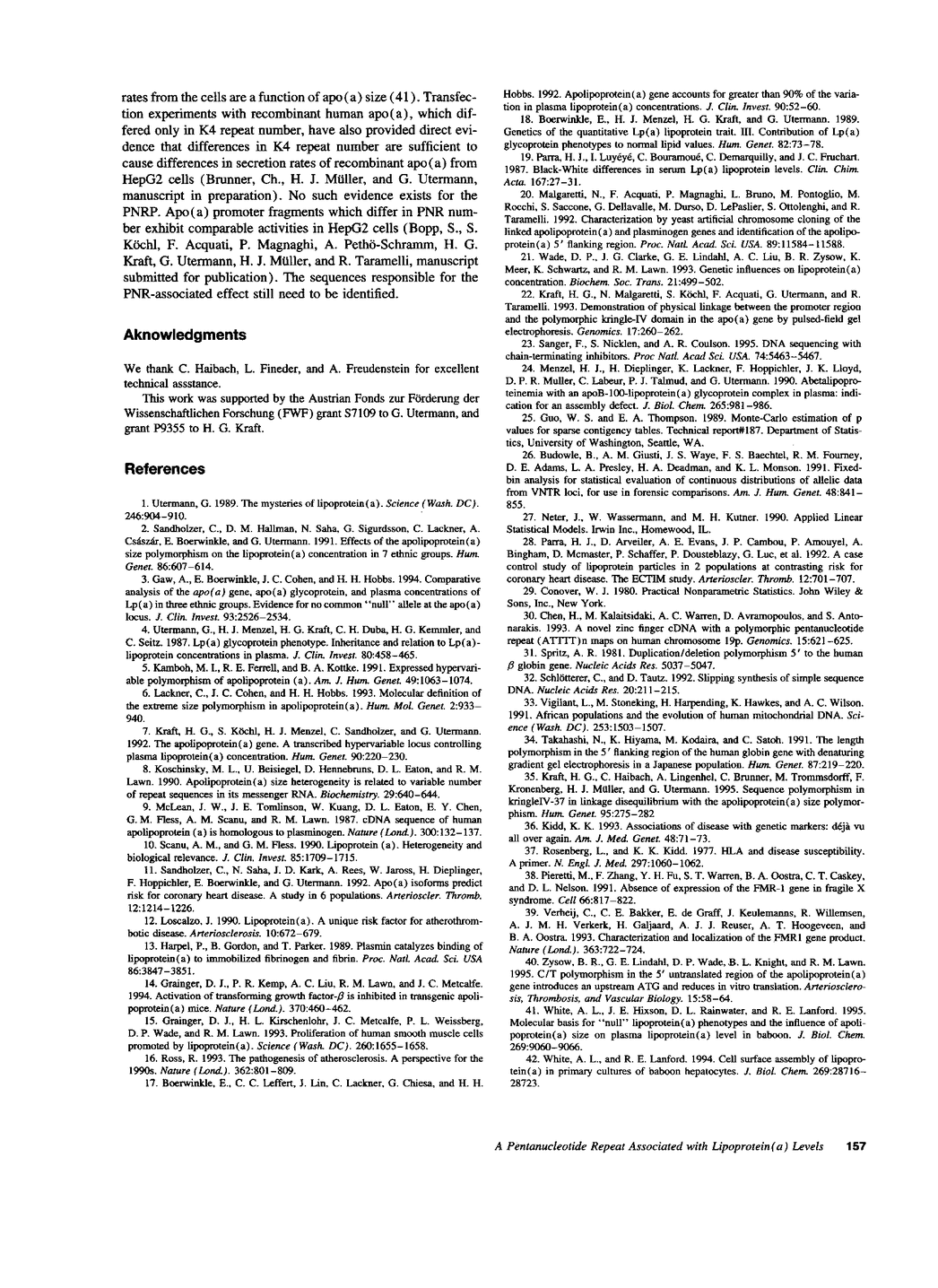 The enormous interindividual variation in the plasma concentrations of the atherogenic lipoprotein(a) [Lp(a)] is almost entirely controlled by the apo(a) locus on chromosome 6q26-q27. A variable number of transcribed kringle4 repeats (K4-VNTR) in the gene explains a large fraction of this variation, whereas the rest is presently unexplained. We here have analyzed the effect of the K4-VNTR and of a pentanucleotide repeat polymorphism (TTTTA)n (n = 6-11) in the 5' control region of the apo(a) gene on plasma Lp(a) levels in unrelated healthy Tyroleans (n = 130), Danes (n = 154), and Black South Africans (n = 112). The K4-VNTR had a significant effect on plasma Lp(a) levels in Caucasians and explained 41 and 45% of the variation in Lp(a) plasma concentration in Tyroleans and Danes, respectively. Both, the pentanucleotide repeat (PNR) allele frequencies and their effects on Lp(a) concentrations were heterogeneous among populations. A significant negative correlation between the number of pentanucleotide repeats and the plasma Lp(a) concentration was observed in Tyroleans and Danes. The effect of the 5' PNRP on plasma Lp(a) concentrations was independent from the K4-VNTR and explained from 10 to 14% of the variation in Lp(a) concentrations in Caucasians. No significant effect of the PNRP was present in Black Africans. This suggests allelic association between PNR alleles and sequences affecting Lp(a) levels in Caucasians. Thus, in Caucasians but not in Blacks, concentrations of the atherogenic Lp(a) particle are strongly associated with two repeat polymorphisms in the apo(a) gene.