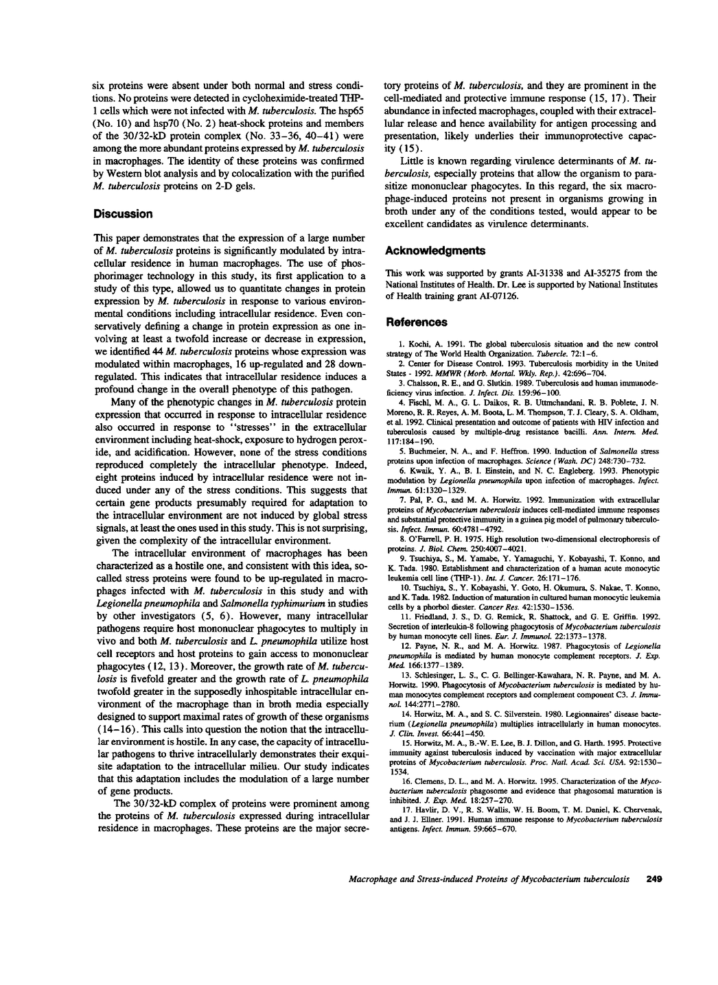Using phosphorimager technology to quantitate differences in protein expression, we have investigated the modulation of protein synthesis by Mycobacterium tuberculosis in response to intracellular residence in human macrophages and, for comparison, in response to various stress conditions during extracellular growth. Proteins of M. tuberculosis growing intracellularly in human THP-1 cells and extracellularly in broth were labeled with [35S]methionine; during intracellular growth, host cell protein synthesis was inhibited with cycloheximide. The metabolically labeled proteins were separated by two-dimensional gel electrophoresis and quantitatively analyzed. Intracellular residence in macrophages induced a profound change in the overall phenotype of M. tuberculosis. The expression of at least 16 M. tuberculosis proteins was induced (at least a twofold increase compared with growth in broth) and 28 proteins repressed (at least a twofold decrease). Many of the phenotypic changes in protein expression induced during intracellular growth occurred during extracellular growth in response to stress conditions including heat-shock, low pH, and H2O2. However, the pattern of induced and repressed proteins was unique to each stress condition. Of the 16 macrophage-induced proteins, 6 were absent during extracellular growth under both normal and stress conditions. Such proteins are potential virulence determinants and/or they may be important in the cell-mediated and protective immune response to M. tuberculosis infection.