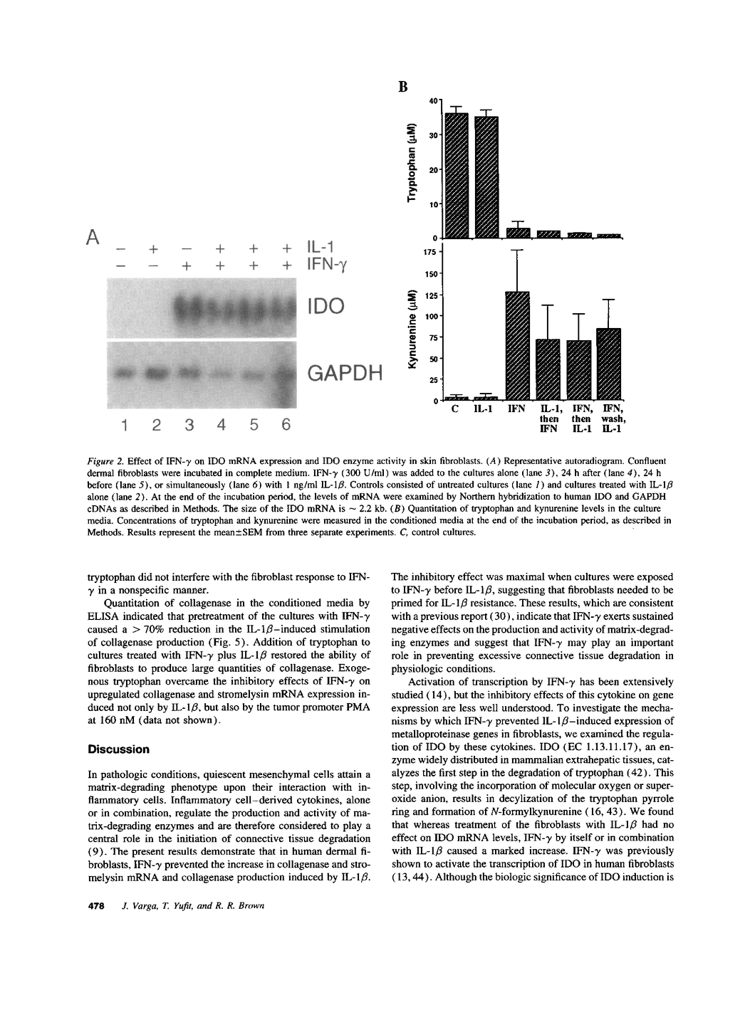 The expression of the matrix-degrading enzymes collagenase and stromelysin is modulated by a variety of biologic and pharmacologic agents. IFN-gamma has potent effects on metalloproteinase production and therefore may play an important role in preventing excessive connective tissue degradation during inflammation and repair. We investigated the mechanisms of collagenase and stromelysin regulation by IFN-gamma in human dermal fibroblasts. IFN-gamma (300 U/ml) prevented the stimulation of metalloproteinase gene expression by IL-1 beta. In addition, incubation of fibroblasts with IFN-gamma resulted in a marked increase in cellular indoleamine 2,3-dioxygenase (IDO) mRNA, a > 90% depletion of tryptophan, and a corresponding > 30-fold increase in the tryptophan metabolite kynurenine in the culture media. Reducing the concentration of tryptophan from 25 microM to 0 markedly diminished the ability of fibroblasts to increase collagenase and stromelysin mRNA and collagenase production in response to IL-1 beta. Addition of exogenous tryptophan (25-50 micrograms/ml) to cultures that had been tryptophan depleted by pretreatment with IFN-gamma for 48 h restored the fibroblast response to IL-1 beta or PMA, but had no effect on IFN-gamma-induced HLA-DR alpha chain mRNA expression. These results indicate that inhibition of collagenase and stromelysin gene expression by IFN-gamma in fibroblasts is associated with activation of IDO and enhanced cellular tryptophan metabolism. Tryptophan degradation and ensuing tryptophan depletion may account, at least in part, for the inhibitory effect of IFN-gamma on metalloproteinase production in dermal fibroblasts.