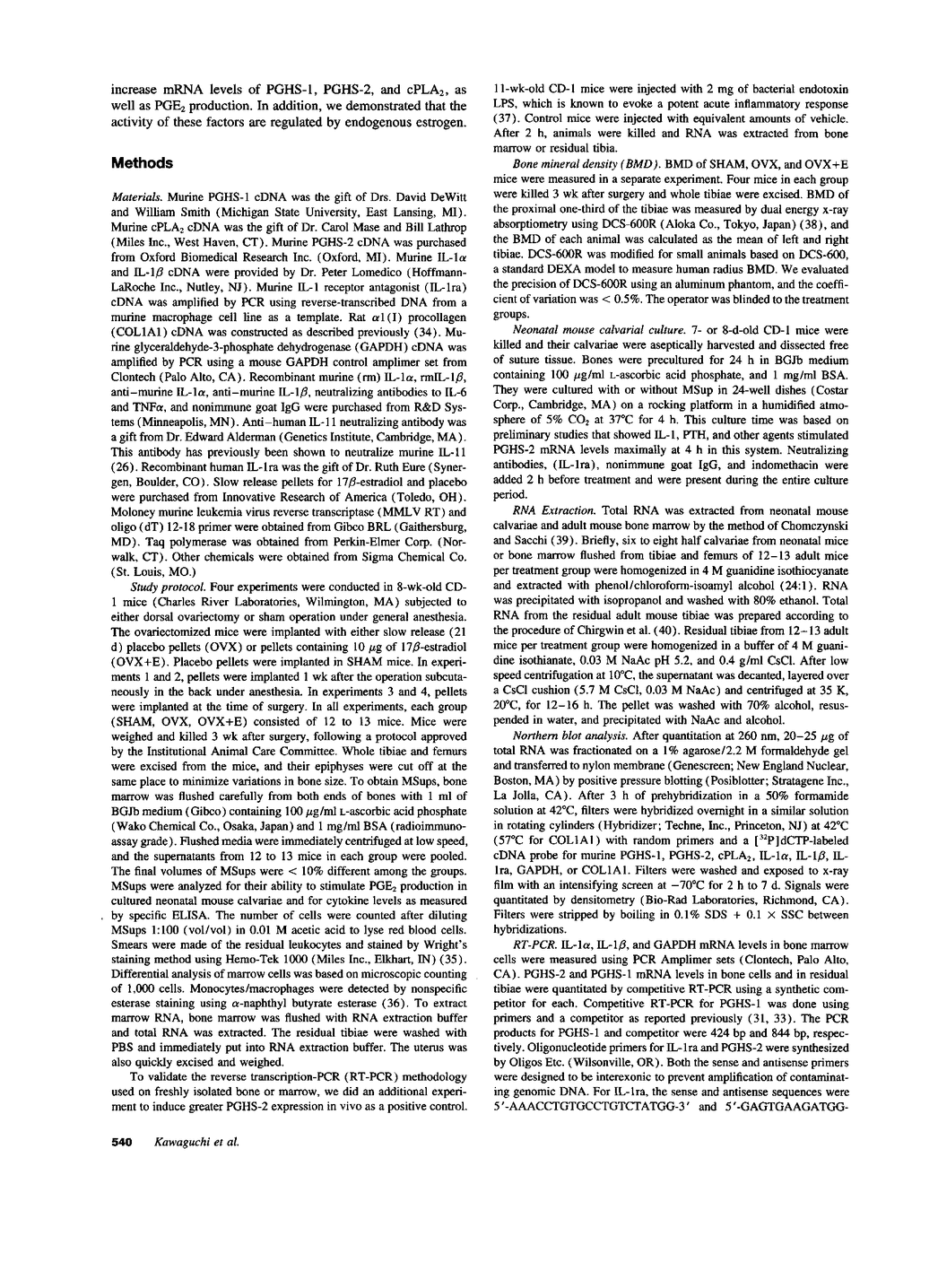 To examine PG production in estrogen deficiency, we studied effects on cultured neonatal mouse calvariae of bone marrow supernatants (MSup) from sham-operated (SHAM), ovariectomized (OVX), or 17 beta-estradiol (OVX+E)-treated mice. MSups were obtained 3 wk after OVX when bone density had decreased significantly. 10-60% MSup increased medium PGE2 and levels of mRNA for inducible and constitutive prostaglandin G/H synthase (PGHS-2 and PGHS-1) and cytosolic phospholipase A2 in calvarial cultures. OVX MSups had twofold greater effects on PGHS-2 and medium PGE2 than other MSups. IL-1 receptor antagonist and anti-IL-1 alpha neutralizing antibody decreased MSup-stimulated PGHS-2 mRNA and PGE2 levels and diminished differences among OVX, sham-operated, and OVX+E groups. In contrast, antibodies to IL-1 beta, IL-6, IL-11, and TNF alpha had little effect. There were no significant differences in IL-1 alpha concentrations or IL-1 alpha mRNA levels in MSups or marrow cells. PGHS-2 mRNA in freshly isolated tibiae from OVX mice was slightly greater than from sham-operated. We conclude that bone marrow factors can increase PG production through stimulation of PGHS-2; that OVX increases and estrogen decreases activity of these factors; and that IL-1 alpha activity, together with additional unknown factors, mediates the differential MSup effects.