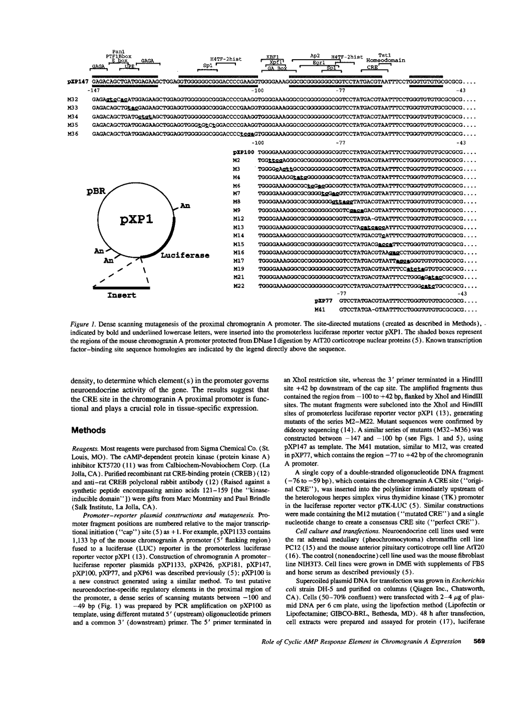 Chromogranin A, a soluble acidic protein, is a ubiquitous component of secretory vesicles throughout the neuroendocrine system. We reported previously the cloning and initial characterization of the mouse chromogranin A gene promoter, which showed that the promoter contains both positive and negative domains and that a proximal promoter spanning nucleotides -147 to +42 bp relative to the transcriptional start site is sufficient for neuroendocrine cell type-specific expression. The current study was undertaken to identify the particular elements within this proximal promoter that control tissue-specific expression. We found that deletion or point mutations in the potential cAMP response element (CRE) site at -68 bp virtually abolished promoter activity specifically in neuroendocrine (PC12 chromaffin or AtT20 corticotrope) cells, with little effect on activity in control (NIH3T3 fibroblast) cells; thus, the CRE box is necessary for neuroendocrine cell type-specific activity of the chromogranin A promoter. Furthermore, the effect of the CRE site is enhanced in the context of intact (wild-type) promoter sequences between -147 and -100 bp. DNase I footprint analysis showed that these regions (including the CRE box) bind nuclear proteins present in both neuroendocrine (AtT20) and control (NIH3T3) cells. In AtT20 cells, electrophoretic mobility shift assays and factor-specific antibody supershifts showed that an oligonucleotide containing the chromogranin A CRE site formed a single, homogeneous protein-DNA complex containing the CRE-binding protein CREB. However, in control NIH3T3 cells we found evidence for an additional immunologically unrelated protein in this complex. A single copy of this oligonucleotide was able to confer neuroendocrine-specific expression to a heterologous (thymidine kinase) promoter, albeit with less fold selectivity than the full proximal chromogranin A promoter. Hence, the CRE site was partially sufficient to explain the neuroendocrine cell type specificity of the promoter. The functional activity of the CRE site was confirmed through studies of the endogenous chromogranin A gene. Northern mRNA analysis showed that expression of the endogenous chromogranin A gene was stimulated seven- to eightfold by cAMP in PC12 cells, whereas no induction occurred in the NIH3T3 cells. Similar cAMP induction was obtained with the transfected chromogranin A promoter in PC12 cells, and abolition of the CRE site (by deletion or point mutation) eliminated the induction. Thus, the CRE site in the chromogranin A proximal promoter is functional and plays a crucial, indeed indispensable, role in neuroendocrine-specific expression of the gene. These results also provide insight into transcriptional mechanisms governing acquisition of the neuroendocrine secretory phenotype.
