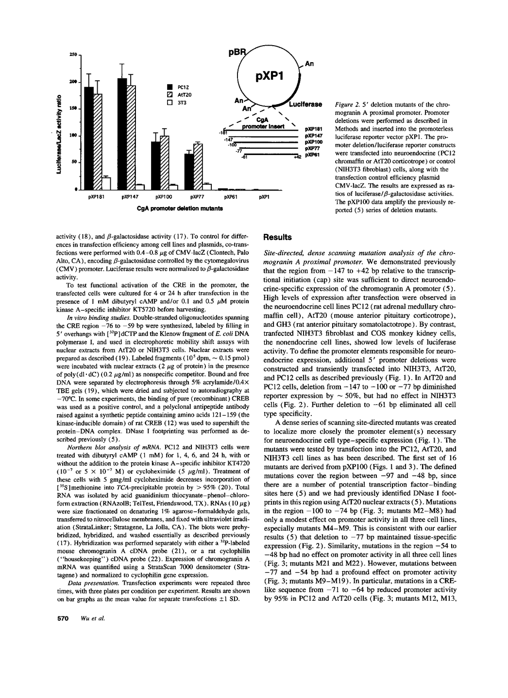 Chromogranin A, a soluble acidic protein, is a ubiquitous component of secretory vesicles throughout the neuroendocrine system. We reported previously the cloning and initial characterization of the mouse chromogranin A gene promoter, which showed that the promoter contains both positive and negative domains and that a proximal promoter spanning nucleotides -147 to +42 bp relative to the transcriptional start site is sufficient for neuroendocrine cell type-specific expression. The current study was undertaken to identify the particular elements within this proximal promoter that control tissue-specific expression. We found that deletion or point mutations in the potential cAMP response element (CRE) site at -68 bp virtually abolished promoter activity specifically in neuroendocrine (PC12 chromaffin or AtT20 corticotrope) cells, with little effect on activity in control (NIH3T3 fibroblast) cells; thus, the CRE box is necessary for neuroendocrine cell type-specific activity of the chromogranin A promoter. Furthermore, the effect of the CRE site is enhanced in the context of intact (wild-type) promoter sequences between -147 and -100 bp. DNase I footprint analysis showed that these regions (including the CRE box) bind nuclear proteins present in both neuroendocrine (AtT20) and control (NIH3T3) cells. In AtT20 cells, electrophoretic mobility shift assays and factor-specific antibody supershifts showed that an oligonucleotide containing the chromogranin A CRE site formed a single, homogeneous protein-DNA complex containing the CRE-binding protein CREB. However, in control NIH3T3 cells we found evidence for an additional immunologically unrelated protein in this complex. A single copy of this oligonucleotide was able to confer neuroendocrine-specific expression to a heterologous (thymidine kinase) promoter, albeit with less fold selectivity than the full proximal chromogranin A promoter. Hence, the CRE site was partially sufficient to explain the neuroendocrine cell type specificity of the promoter. The functional activity of the CRE site was confirmed through studies of the endogenous chromogranin A gene. Northern mRNA analysis showed that expression of the endogenous chromogranin A gene was stimulated seven- to eightfold by cAMP in PC12 cells, whereas no induction occurred in the NIH3T3 cells. Similar cAMP induction was obtained with the transfected chromogranin A promoter in PC12 cells, and abolition of the CRE site (by deletion or point mutation) eliminated the induction. Thus, the CRE site in the chromogranin A proximal promoter is functional and plays a crucial, indeed indispensable, role in neuroendocrine-specific expression of the gene. These results also provide insight into transcriptional mechanisms governing acquisition of the neuroendocrine secretory phenotype.