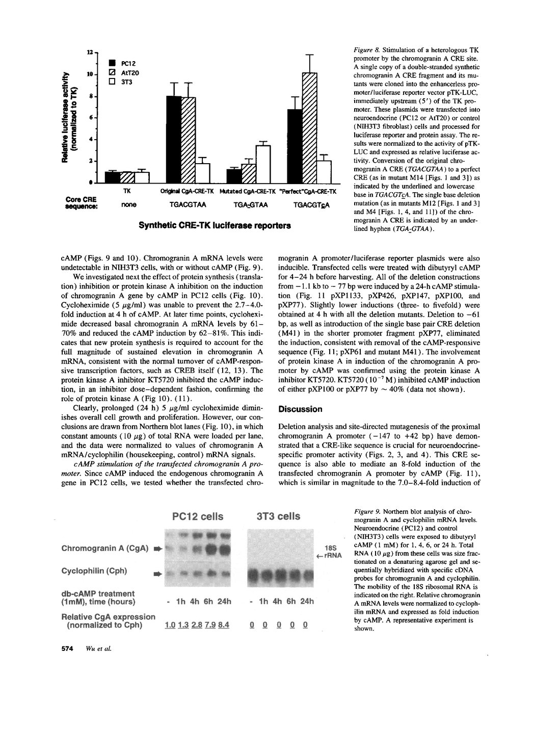 Chromogranin A, a soluble acidic protein, is a ubiquitous component of secretory vesicles throughout the neuroendocrine system. We reported previously the cloning and initial characterization of the mouse chromogranin A gene promoter, which showed that the promoter contains both positive and negative domains and that a proximal promoter spanning nucleotides -147 to +42 bp relative to the transcriptional start site is sufficient for neuroendocrine cell type-specific expression. The current study was undertaken to identify the particular elements within this proximal promoter that control tissue-specific expression. We found that deletion or point mutations in the potential cAMP response element (CRE) site at -68 bp virtually abolished promoter activity specifically in neuroendocrine (PC12 chromaffin or AtT20 corticotrope) cells, with little effect on activity in control (NIH3T3 fibroblast) cells; thus, the CRE box is necessary for neuroendocrine cell type-specific activity of the chromogranin A promoter. Furthermore, the effect of the CRE site is enhanced in the context of intact (wild-type) promoter sequences between -147 and -100 bp. DNase I footprint analysis showed that these regions (including the CRE box) bind nuclear proteins present in both neuroendocrine (AtT20) and control (NIH3T3) cells. In AtT20 cells, electrophoretic mobility shift assays and factor-specific antibody supershifts showed that an oligonucleotide containing the chromogranin A CRE site formed a single, homogeneous protein-DNA complex containing the CRE-binding protein CREB. However, in control NIH3T3 cells we found evidence for an additional immunologically unrelated protein in this complex. A single copy of this oligonucleotide was able to confer neuroendocrine-specific expression to a heterologous (thymidine kinase) promoter, albeit with less fold selectivity than the full proximal chromogranin A promoter. Hence, the CRE site was partially sufficient to explain the neuroendocrine cell type specificity of the promoter. The functional activity of the CRE site was confirmed through studies of the endogenous chromogranin A gene. Northern mRNA analysis showed that expression of the endogenous chromogranin A gene was stimulated seven- to eightfold by cAMP in PC12 cells, whereas no induction occurred in the NIH3T3 cells. Similar cAMP induction was obtained with the transfected chromogranin A promoter in PC12 cells, and abolition of the CRE site (by deletion or point mutation) eliminated the induction. Thus, the CRE site in the chromogranin A proximal promoter is functional and plays a crucial, indeed indispensable, role in neuroendocrine-specific expression of the gene. These results also provide insight into transcriptional mechanisms governing acquisition of the neuroendocrine secretory phenotype.