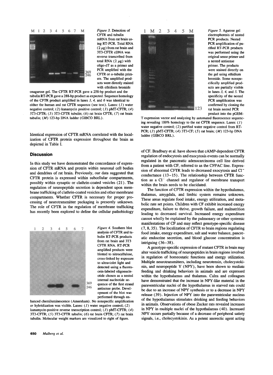 In previous studies we have characterized the expression of the cystic fibrosis transmembrane conductance regulator (CFTR) protein in clathrin-coated vesicles derived from bovine brain and in neurons of rat brain. In this study we have further characterized the expression of the CFTR protein mRNA and protein in rat brain with reverse transcriptase polymerase chain reaction amplification (RT-PCR), in situ hybridization, and immunocytochemistry. The expression of CFTR mRNA and protein in discrete areas of brain, including the hypothalamus, thalamus, and amygdaloid nuclei, which are involved in regulation of appetite and resting energy expenditure, is identical. The presence of CFTR in neurons localized to these regions of brain controlling homeostasis and energy expenditure may elucidate the pathogenesis of other nonpulmonary and gastrointestinal manifestations which commonly are observed in children with cystic fibrosis. Dysregulation of normal neuropeptide vesicle trafficking by mutant CFTR in brain may serve as a pathogenic mechanism for disruption of homeostasis.