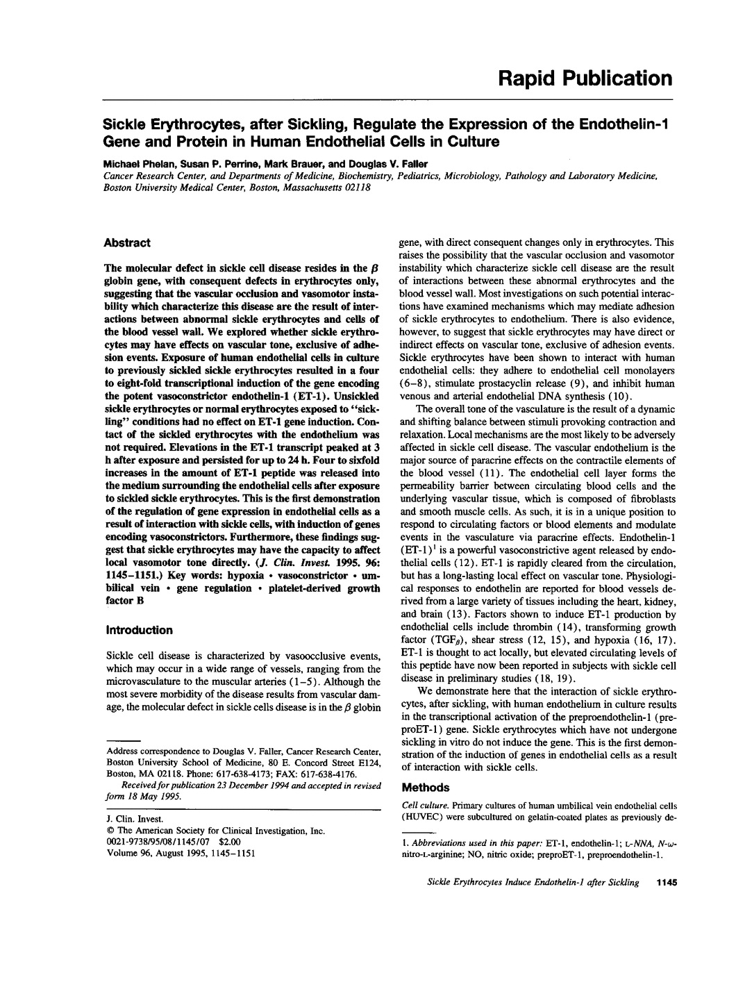 The molecular defect in sickle cell disease resides in the beta globin gene, with consequent defects in erythrocytes only, suggesting that the vascular occlusion and vasomotor instability which characterize this disease are the result of interactions between abnormal sickle erythrocytes and cells of the blood vessel wall. We explored whether sickle erythrocytes may have effects on vascular tone, exclusive of adhesion events. Exposure of human endothelial cells in culture to previously sickled sickle erythrocytes resulted in a four to eight-fold transcriptional induction of the gene encoding the potent vasoconstrictor endothelin-1 (ET-1). Unsickled sickle erythrocytes or normal erythrocytes exposed to "sickling" conditions had no effect on ET-1 gene induction. Contact of the sickled erythrocytes with the endothelium was not required. Elevations in the ET-1 transcript peaked at 3 h after exposure and persisted for up to 24 h. Four to sixfold increases in the amount of ET-1 peptide was released into the medium surrounding the endothelial cells after exposure to sickled sickle erythrocytes. This is the first demonstration of the regulation of gene expression in endothelial cells as a result of interaction with sickle cells, with induction of genes encoding vasoconstrictors. Furthermore, these findings suggest that sickle erythrocytes may have the capacity to affect local vasomotor tone directly.