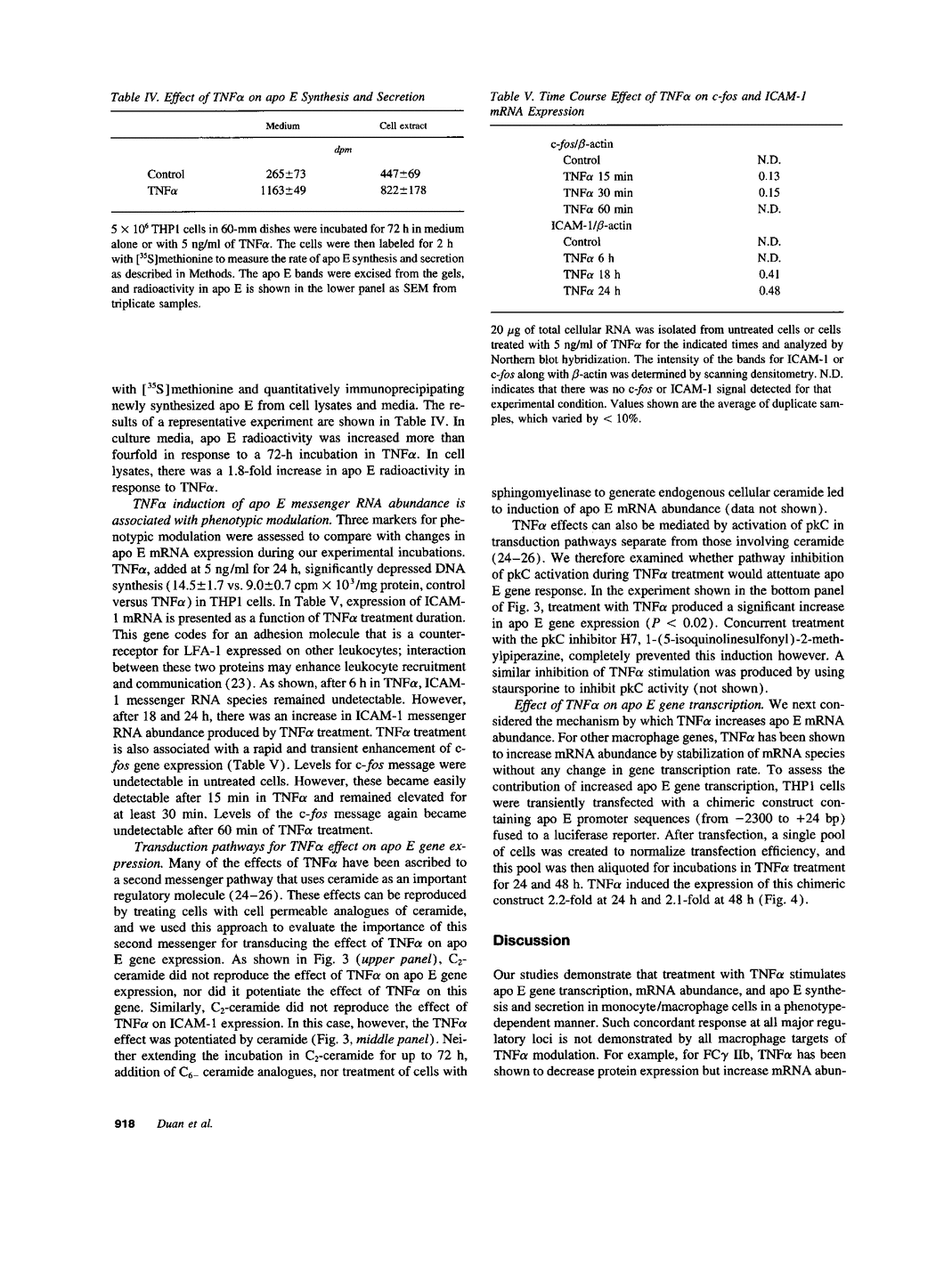 apo E has been shown to modulate cholesterol balance in arterial wall cells. Production of apo E by macrophages in atherosclerotic plaques could thereby influence the development of the plaque lesion. Cytokines, including TNF alpha, have been identified in human lesions, therefore, we undertook a series of studies to evaluate the effect of TNF alpha on monocyte/macrophage apo E production. The addition of TNF alpha to freshly isolated human monocytes led to a four- to fivefold increase of apo E mRNA abundance. The addition of TNF alpha to fully differentiated macrophages either had no effect or modestly inhibited apo E mRNA expression. THP1 human monocytic cells also responded to TNF alpha in a phenotype-specific manner. Treatment of these cells with TNF alpha produced a dose- and time-dependent increase in apo E mRNA. This increase was reflected in apo E synthesis and was associated with inhibition of DNA synthesis, and with induction of c-fos and ICAM-1 gene expression. Cell-permanent analogues of ceramide did not reproduce TNF alpha effect on apo E, but antagonists of protein kinase C did inhibit its effect. TNF alpha induction of apo E mRNA abundance was associated with stimulation of apo E promoter-dependent gene transcription. In summary, TNF alpha stimulates apo E gene transcription, mRNA abundance, and protein synthesis in the monocyte/macrophage in a phenotype-specific manner. Such regulation could significantly modify the amount of apo E present in vessel wall lesions.