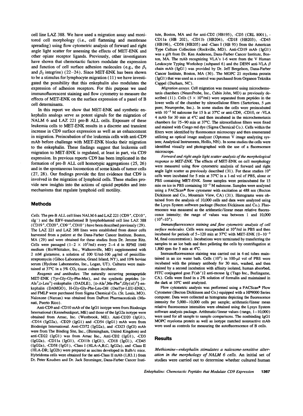Opioid peptides have been implicated in the regulation of tumor growth and biology; however, little attention has been given to the mechanisms that are involved. In this study we show that physiological concentrations of the endogenous opioid neuropeptide methionine-enkephalin (MET-ENK) and the synthetic enkephalins D-Ala2, Me-Phe4, Gly(ol)5 and D-Ala2, D-Leu5 are stimulants for the in vitro migration of pre-B acute lymphoblastoid leukemia (ALL) cells. Activation of the human pre-B ALL cell lines NALM 6 and LAZ 221 with MET-ENK resulted in both an increase in their migration and an augmentation in the surface expression of the leukemia cell marker CD9. The opiate receptor antagonist naloxone reversed these enkephalin-induced effects on the leukemia cells. When the pre-B ALL cells were preincubated with an anti-CD9 mAb before challenge with MET-ENK their migration to the enkephalin was markedly reduced. These studies show that endogenous and synthetic opioid peptides are stimulants for pre-B ALL cell migration and suggest that CD9 is important in the regulation of leukemia cell motility.