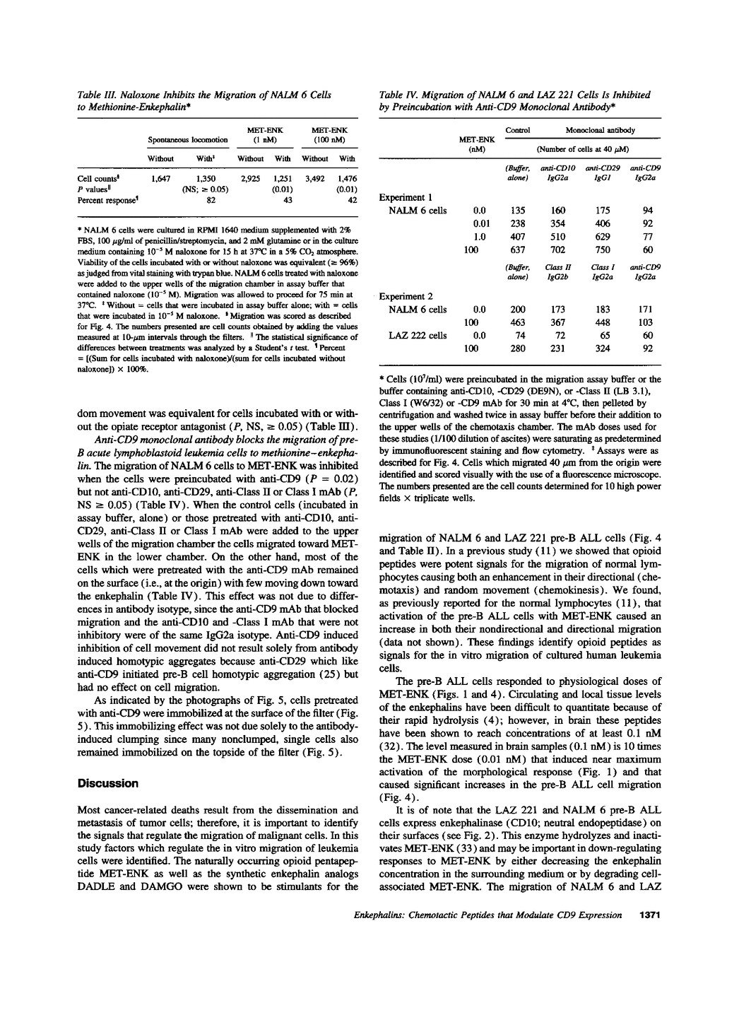 Opioid peptides have been implicated in the regulation of tumor growth and biology; however, little attention has been given to the mechanisms that are involved. In this study we show that physiological concentrations of the endogenous opioid neuropeptide methionine-enkephalin (MET-ENK) and the synthetic enkephalins D-Ala2, Me-Phe4, Gly(ol)5 and D-Ala2, D-Leu5 are stimulants for the in vitro migration of pre-B acute lymphoblastoid leukemia (ALL) cells. Activation of the human pre-B ALL cell lines NALM 6 and LAZ 221 with MET-ENK resulted in both an increase in their migration and an augmentation in the surface expression of the leukemia cell marker CD9. The opiate receptor antagonist naloxone reversed these enkephalin-induced effects on the leukemia cells. When the pre-B ALL cells were preincubated with an anti-CD9 mAb before challenge with MET-ENK their migration to the enkephalin was markedly reduced. These studies show that endogenous and synthetic opioid peptides are stimulants for pre-B ALL cell migration and suggest that CD9 is important in the regulation of leukemia cell motility.
