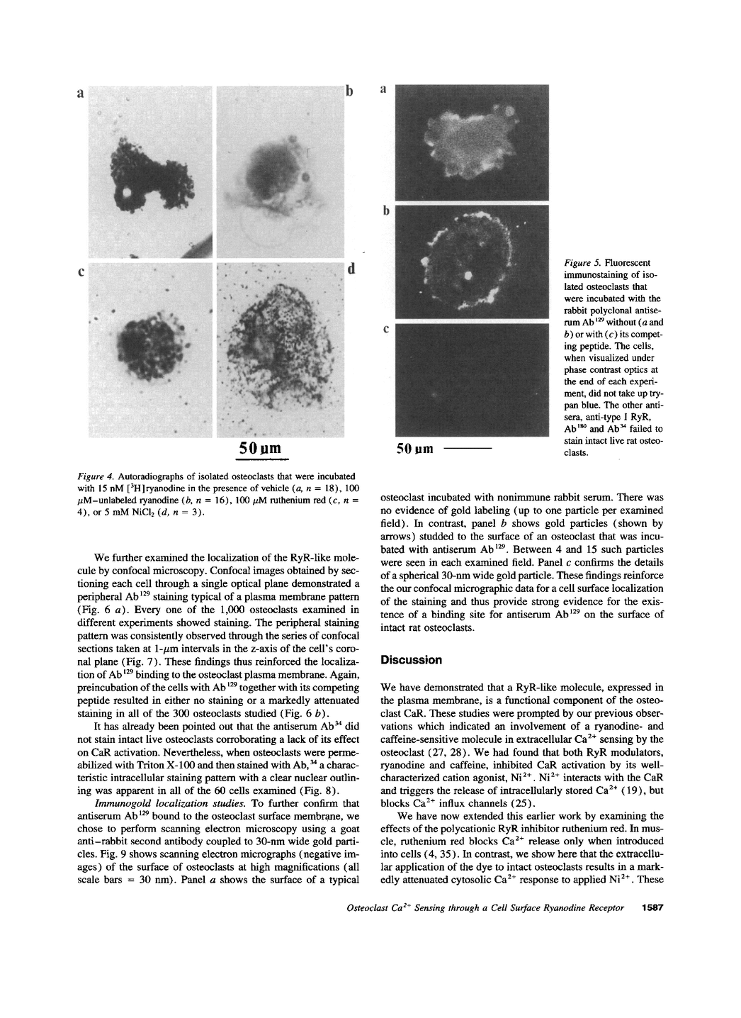 Ryanodine receptors (RyRs) reside in microsomal membranes where they gate Ca2+ release in response to changes in the cytosolic Ca2+ concentration. In the osteoclast, a divalent cation sensor, the Ca2+ receptor (CaR), located within the cell's plasma membrane, monitors changes in the extracellular Ca2+ concentration. Here we show that a RyR-like molecule is a functional component of this receptor. We have demonstrated that [3H] ryanodine specifically binds to freshly isolated rat osteoclasts. The binding was displaced by ryanodine itself, the CaR agonist Ni2+ and the RyR antagonist ruthenium red. The latter also inhibited cytosolic Ca2+ elevations induced by Ni2+. In contrast, the responses to Ni2+ were strongly potentiated by an antiserum Ab129 raised to an epitope located within the channel-forming domain of the type II RyR. The antiserum also stained the surface of intact, unfixed, trypan blue-negative osteoclasts. Serial confocal sections and immunogold scanning electron microscopy confirmed a plasma membrane localization of this staining. Antiserum Ab34 directed to a putatively intracellular RyR epitope expectedly did not stain live osteoclasts nor did it potentiate CaR activation. It did, however, stain fixed, permeabilized cells in a distinctive cytoplasmic pattern. We conclude that an RyR-like molecule resides within the osteoclast plasma membrane and plays in important role in extracellular Ca2+ sensing.