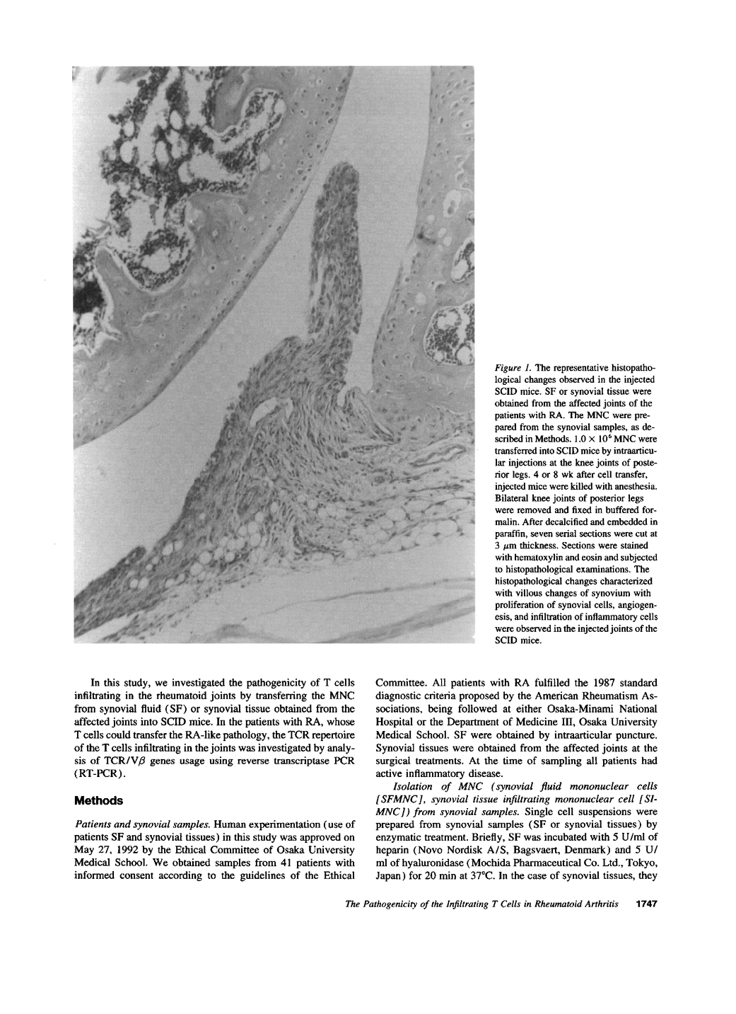 To investigate the pathogenicity of T cells infiltrating in the rheumatoid joints, mononuclear cells (MNC), predominantly T cells, isolated from either synovial fluid or synovial tissues of the patients with RA were transferred into severe combined immunodeficient (SCID) mice by intraarticular injections. According to our observations in this experimental system, patients with RA could be classified into at least two groups. In one group of patients, the infiltrating MNC induced synovial hyperplasia in the recipient SCID mice (the positive group). Whereas, in the other group no synovial hyperplasia was observed (the negative group). The induction of synovial hyperplasia observed in the positive group was prevented by an anti-human CD3 antibody (OKT3), indicating T cell mediation. Analysis of T cell receptor (TCR) V beta usage by reverse transcriptase polymerase chain reaction in the infiltrating MNC transferred into SCID mice revealed a marked skew towards the preferential use of certain V beta genes, which was not seen in the peripheral blood MNC, in only the positive group. The patterns of TCR/V beta skew were not uniform among the patients. The analysis of the PCR-amplified genes of such skewed TCR/ V beta by single strand conformational polymorphism showed distinct bands, indicating that the T cell populations expanding in rheumatoid joints of the positive group were oligoclonal. Furthermore, the enrichment of the T cell populations expressing such skewed TCR/V beta by in vitro stimulation of peripheral blood MNC of the patients with the relevant superantigen enabled the induction of synovial hyperplasia in the SCID mice. These results suggest that the pathogenic T cells could be activated locally in rheumatoid joints by certain antigens in some, but not in all patients with RA.