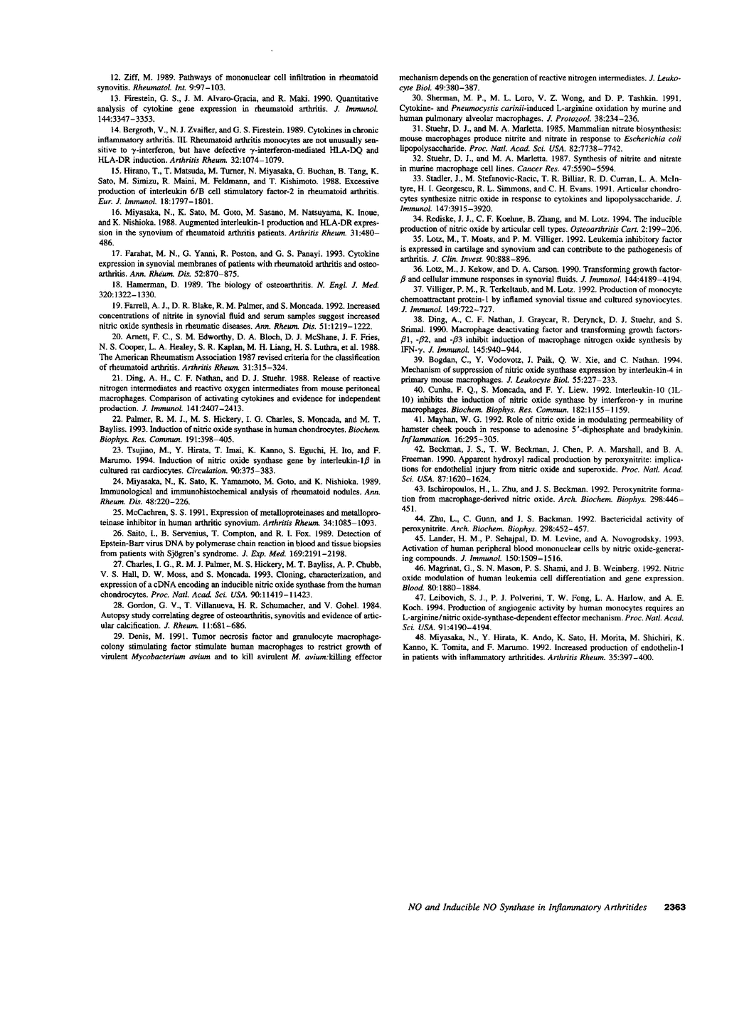In this study, we have identified the source of nitric oxide (NO) produced in the human inflammatory joints by analyzing expression of inducible NO synthase. In ex vivo organ cultures, both inflammatory synovium and cartilage from patients with rheumatoid arthritis produced NO. The NO production was suppressed by NG-monomethyl-L-arginine, an inhibitor of NO synthase. The amount of NO produced by the synovium correlated with the proportion of CD14+ cells in the corresponding tissue (r = 0.8, P < 0.05). Immunohistochemical analysis as well as in situ hybridization showed that inducible NO synthase was predominantly expressed in synovial lining cells, endothelial cells, chondrocytes, and to a lesser extent, in infiltrating mononuclear cells and synovial fibroblasts. The synovial lining cells and the infiltrating cells expressing inducible NO synthase were identified where CD14+ cells were located. Together with morphological features, this suggests that they are type A synoviocytes. NO production from freshly isolated synoviocytes and chondrocytes was up-regulated by in vitro stimulation with a combination of IL-TNF-beta, TNF-alpha, and LPS. In summary, the present results suggest that NO is produced primarily by CD14+ synoviocytes, chondrocytes, and endothelial cells in inflammatory joints of arthritides. NO production can be upregulated by cytokines present in inflamed joints. The increased NO production may thus contribute to the pathological features in inflammatory arthritides.