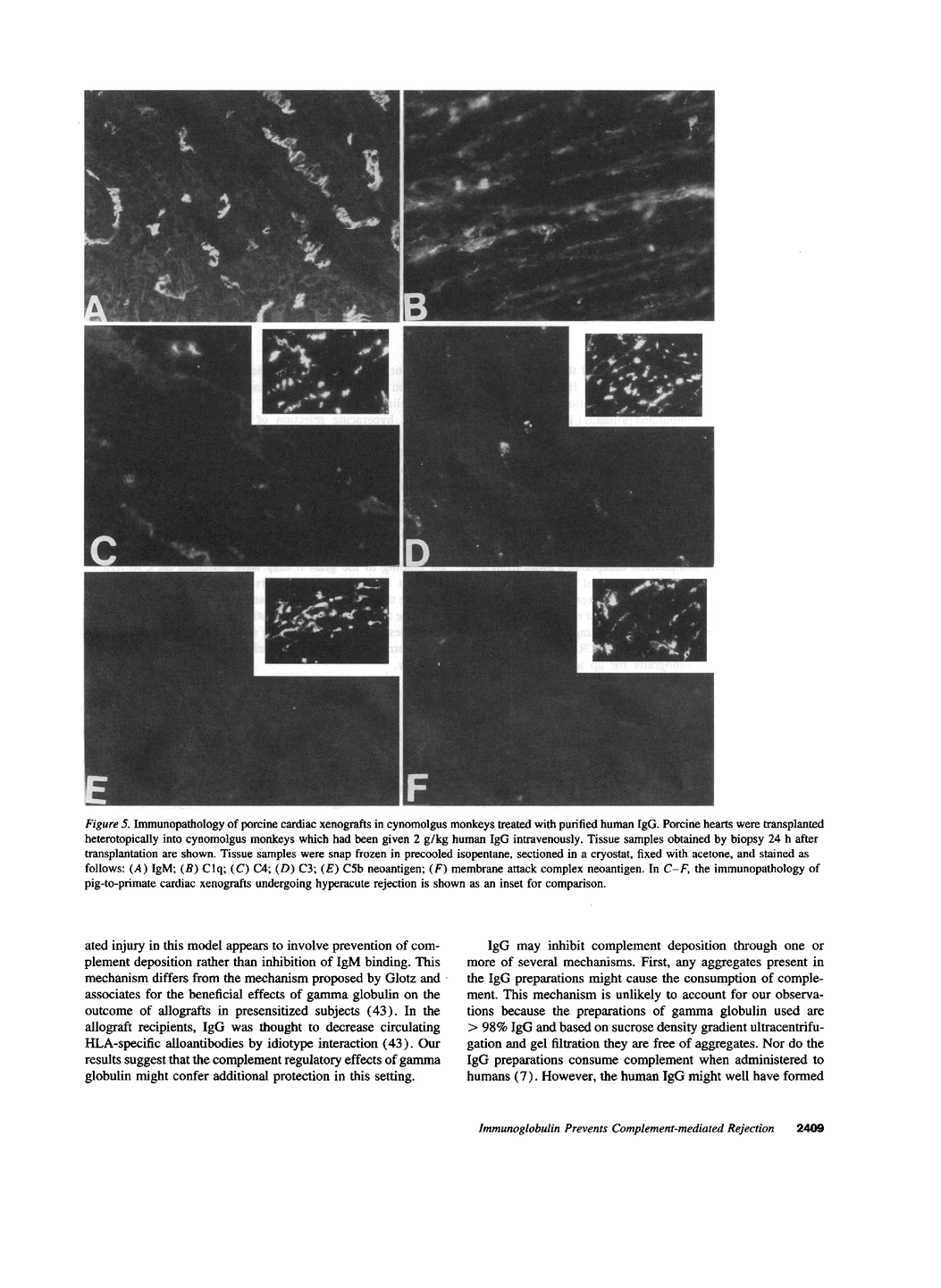 Immunoglobulins regulate the complement system by activating complement on foreign surfaces and diverting reactive complement proteins away from autologous cell surfaces. Based on this model, we explored the ability of Ig to balance complement activation versus control in a pig-to-primate cardiac xenotransplantation model in which the binding of xenoreactive antibodies of the recipient to graft blood vessels and the activation of complement cause hyperacute rejection. Human IgG added to human serum caused a dose-dependent decrease in deposition of iC3b, cytotoxicity, and heparan sulfate release when the serum was incubated with porcine endothelial cells. This decrease was not caused by alteration in antibody binding or consumption of complement but presumably reflected decreased formation of C3 convertase on the endothelial cells. Infusion of purified human IgG into nonhuman primates prevented hyperacute rejection of porcine hearts transplanted into the primates. As expected, the transplants contained deposits of recipient Ig and C1q but not other complement components. The inhibition of complement on endothelial cell surfaces and in the xenotransplantation model supports the idea that IgG regulates the classical complement pathway and supports therapeutic use of that agent in humoral-mediated disease.
