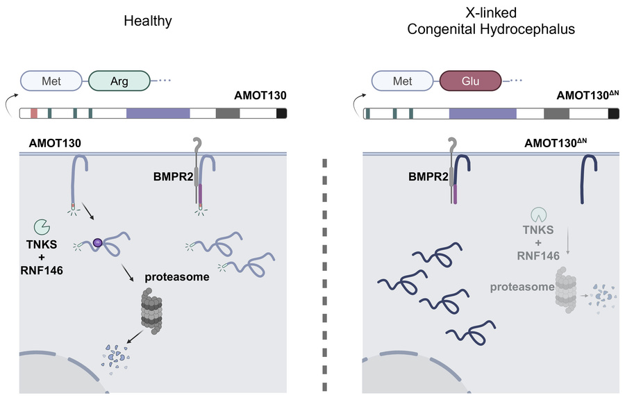 Congenital hydrocephalus is a life-threatening condition that might affect brain development by increasing the pressure on the brain parenchyma. Here, we describe 6 male patients from 1 family, all presenting with an isolated X-linked congenital hydrocephalus. Exome sequencing identified a likely pathogenic variant of angiomotin (AMOT) that segregated with the phenotype in the extended family. We show that the variant, affecting the first methionine, translated into a shorter AMOT protein lacking 91 amino acids from the N-terminus. Mechanistically, we unraveled that the absence of the N-terminus leads to abnormally increased AMOT protein levels due to the loss of both the N-degron degradation signal and the tankyrase-binding domain. Altered degradation of AMOT disrupted the barrier integrity of the cells. Thus, the identified AMOT variant likely underlies the clinical presentation of isolated X-linked hydrocephalus in this family, and our data underscore the importance of tight regulation of AMOT protein level in the brain. AMOT now joins the list of genes involved in congenital hydrocephalus in humans. These findings are instrumental for the genetic counseling of affected families.