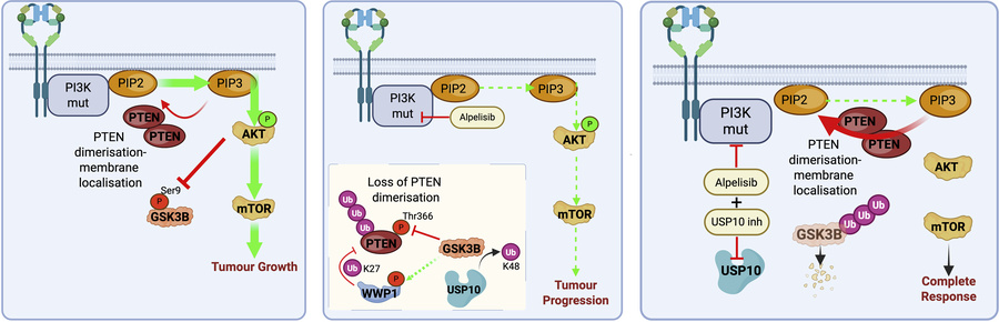 Activating mutations in PIK3CA, the gene encoding the catalytic p110α subunit of PI3K, are some of the most frequent genomic alterations in breast cancer. Alpelisib, a small-molecule inhibitor that targets p110α, is a recommended drug for patients with PIK3CA-mutant advanced breast cancer. However, clinical success for PI3K inhibitors (PI3Kis) has been limited by their narrow therapeutic window. The lipid phosphatase PTEN is a potent tumor suppressor and a major negative regulator of the PI3K pathway. Unsurprisingly, inactivating mutations in PTEN correlate with tumor progression and resistance to PI3K inhibition due to persistent PI3K signaling. Here, we demonstrate that PI3K inhibition leads rapidly to the inactivation of PTEN. Using a functional genetic screen, we show that this effect is mediated by a USP10-GSK3β signaling axis, in which USP10 stabilizes GSK3β, resulting in GSK3β-mediated phosphorylation of the C-terminal tail of PTEN. This phosphorylation inhibits PTEN dimerization and thus prevents its activation. Downregulation of GSK3β or USP10 resensitizes PI3Ki-resistant breast cancer models and patient-derived organoids to PI3K inhibition and induces tumor regression. Our study establishes that enhancing PTEN activity is a new strategy to treat PIK3CA mutant tumors and provides a strong rationale for pursuing USP10 inhibitors in the clinic.