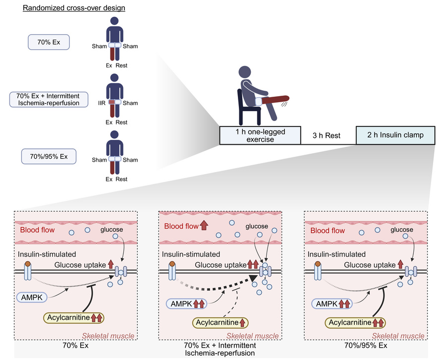 A single bout of exercise improves muscle insulin sensitivity for up to 48 hours via AMPK. Limb ischemia activates AMPK in muscle, and subsequent reperfusion enhances insulin-stimulated vasodilation, potentially eliciting a more pronounced exercise effect with reduced workload. We investigated the combined effect of upper leg intermittent ischemia/reperfusion (IIR) and continuous knee-extension exercise on muscle insulin sensitivity regulation. We found that IIR exercise potentiated AMPK activation and muscle insulin sensitivity. The potentiating effect of IIR exercise on muscle insulin sensitivity was associated with increased insulin-stimulated blood flow in parallel with enhanced phosphorylation of endothelial nitric oxide synthase. Metabolomics analyses demonstrated a suppression of muscle medium-chain acylcarnitines during IIR exercise, which correlated with insulin sensitivity and was consistent with findings in isolated rat muscle treated with decanoyl-l-carnitine. Collectively, combining IIR with low- to moderate-intensity exercise may represent a promising intervention to effectively enhance muscle insulin sensitivity. This approach could offer potential for mitigating muscle insulin resistance in clinical settings and among individuals with lower physical activity levels.