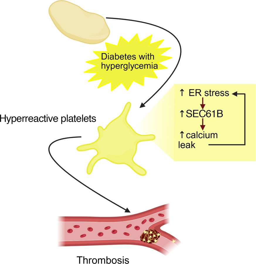 Platelet hyperreactivity increases the risk of cardiovascular thrombosis in diabetes and failure of antiplatelet drug therapies. Elevated basal and agonist-induced calcium flux is a fundamental cause of platelet hyperreactivity in diabetes; however, the mechanisms responsible for this remain largely unknown. Using a high-sensitivity, unbiased proteomic platform, we consistently detected over 2,400 intracellular proteins and identified proteins that were differentially released by platelets in type 2 diabetes. We identified that SEC61 translocon subunit β (SEC61B) was increased in platelets from humans and mice with hyperglycemia and in megakaryocytes from mice with hyperglycemia. SEC61 is known to act as an endoplasmic reticulum (ER) calcium leak channel in nucleated cells. Using HEK293 cells, we showed that SEC61B overexpression increased calcium flux into the cytosol and decreased protein synthesis. Concordantly, platelets in hyperglycemic mice mobilized more calcium and had decreased protein synthesis. Platelets in both humans and mice with hyperglycemia had increased ER stress. ER stress induced the expression of platelet SEC61B and increased cytosolic calcium. Inhibition of SEC61 with anisomycin decreased platelet calcium flux and inhibited platelet aggregation in vitro and in vivo. These studies demonstrate the existence of a mechanism whereby ER stress–induced upregulation of platelet SEC61B leads to increased cytosolic calcium, potentially contributing to platelet hyperreactivity in diabetes.