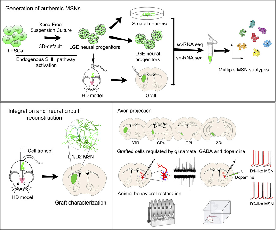 Dysfunction of striatal medium spiny neurons (MSNs) is implicated in several neurological disorders, including Huntington’s disease (HD). Despite progress in characterizing MSN pathology in HD, mechanisms underlying MSN susceptibility remain unknown, driving the need for MSNs derived from human pluripotent stem cells (hPSCs), especially subtypes in research and therapy. Here, we established a scalable 3D-default culture system to produce striatal MSNs efficiently from hPSCs by activation of the endogenous sonic hedgehog (SHH) pathway. These cells expressed canonical markers of striatal progenitors and dopamine D1 (D1) and dopamine D2 (D2) MSNs and presented dynamic specification and transcriptional signatures that closely resemble endogenous MSNs at single-cell resolution, both in vitro and post-transplantation in HD mice with quinolinic acid (QA) lesions. Grafted human cells survived and matured into D1-/D2-like MSNs and projected axons to endogenous targets including globus pallidus externus, globus pallidus internus, and substantia nigra pars reticulata to reconstruct the basal ganglia pathways. Functionally, they displayed spontaneous synaptic currents, received regulation from host cortex and thalamus, and were modulated by dopamine to either enhance or reduce neuronal excitability, similar to the endogenous D1-/D2-MSNs, subsequently improving behavior in QA-lesioned HD mice. Our study presents a method for generating authentic MSNs, providing a reliable cell source for HD cell therapy, mechanistic studies, and drug screening.