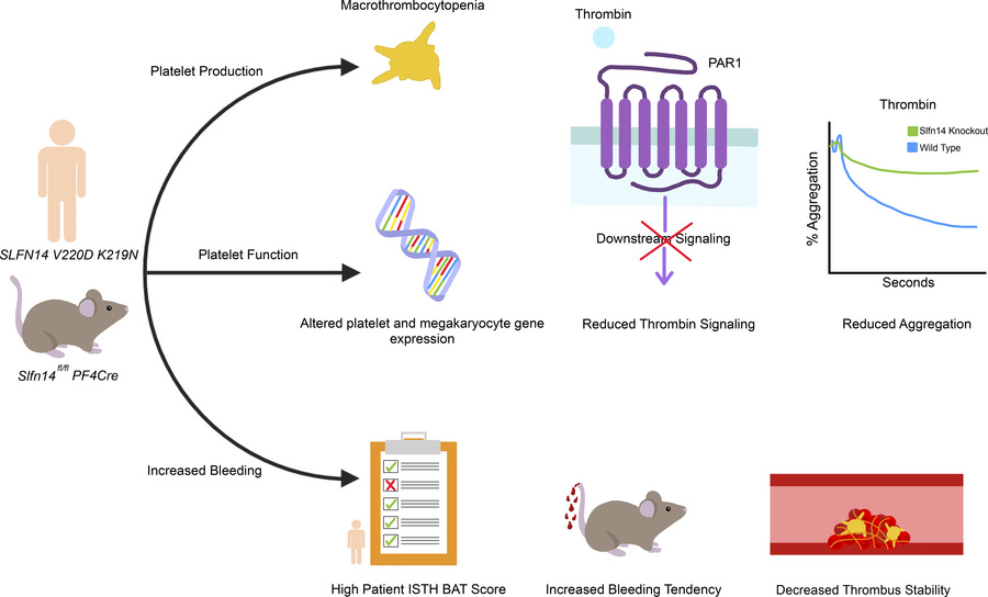 Schlafen 14–related (SLFN14-related) thrombocytopenia is a rare bleeding disorder caused by SLFN14 mutations altering hemostasis in patients with platelet dysfunction. SLFN proteins are highly conserved in mammals where SLFN14 is specifically expressed in megakaryocyte (MK) and erythroblast lineages. The role of SLFN14 in megakaryopoiesis and platelet function has not been elucidated. Therefore, we generated a murine model with a platelet- and MK-specific SLFN14 deletion using platelet factor 4 (PF4) Cre-mediated deletion of exons 2 and 3 in Slfn14 (Slfn14 PF4-Cre) to decipher the molecular mechanisms driving the bleeding phenotype. Slfn14 PF4-Cre+ platelets displayed reduced platelet signaling to thrombin, reduced thrombin formation, increased bleeding tendency, and delayed thrombus formation as assessed by intravital imaging. Moreover, fewer in situ bone marrow MKs were present compared with controls. RNA-Seq and Gene Ontology analysis of MKs and platelets from Slfn14 PF4-Cre homozygous mice revealed altered pathways of ubiquitination, adenosine triphosphate activity, and cytoskeleton and molecular function. In summary, we investigated how SLFN14 deletion in MKs and platelets leads to platelet dysfunction and alters their transcriptome, explaining the platelet dysfunction and bleeding in humans and mice with SLFN14 mutations.