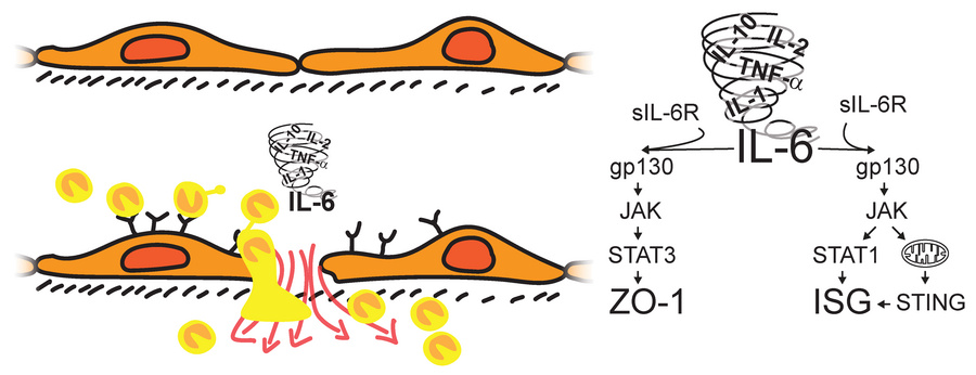 Severe systemic inflammatory reactions, including sepsis, often lead to shock, organ failure, and death, in part through an acute release of cytokines that promote vascular dysfunction. However, little is known about the vascular endothelial signaling pathways regulating the transcriptional profile in failing organs. Our work focused on signaling downstream of IL-6, due to its clinical importance as a biomarker for disease severity and predictor of mortality. Here, we show that loss of endothelial expression of the IL-6 pathway inhibitor SOCS3 promoted a type I IFN–like (IFNI-like) gene signature in response to endotoxemia in mouse kidneys and brains. In cultured primary human endothelial cells, IL-6 induced transient IFNI-like gene expression in a noncanonical, IFN-independent fashion. We further show that STAT3, which we had previously demonstrated to control IL-6–driven endothelial barrier function, was dispensable for this activity. Instead, IL-6 promoted a transient increase in cytosolic mitochondrial DNA and required STAT1, cGAS, STING, and IRF1, -3, and -4. Inhibition of this pathway in endothelial cell–specific STING-KO mice or global STAT1-KO mice led to reduced the severity of the response to acute endotoxemic challenge and prevented expression of an endotoxin-induced IFNI-like gene signature. These results suggest that permeability and DNA-sensing responses are driven by parallel pathways downstream of this cytokine, provide potential insights into the complex response to acute inflammatory responses, and offer the possibility of novel therapeutic strategies for independently controlling the intracellular responses to IL-6 in order to tailor the inflammatory response.