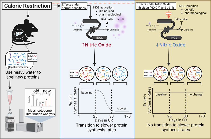 Calorie restriction (CR) extends maximal lifespan and maintains cellular homeostasis in various animal models. We have previously shown that CR induces a global reduction of protein fractional synthesis rates (FSRs) across the hepatic proteome in mice, but the timing and regulatory mechanisms remain unclear. Nitric oxide (NO), a bioactive molecule upregulated during CR, is a potential regulator of protein synthesis. To explore the role of NO in hepatic proteome fluxes during CR, we used in vivo deuterium labeling from heavy water and liquid chromatography/mass spectrometry–based (LC/MS-based) flux proteomics in WT and NO-deficient (NO–) mice. We observed a transition to reduced global protein FSRs that occurred rapidly between days 25 and 30 of CR. NO deficiency, whether genetic or pharmacological, disrupted the slowing of proteome-wide fluxes and the beneficial effects on body composition and physiology. Administering the NO donor molsidomine restored the reduction in hepatic FSRs in NO– mice. Furthermore, inhibiting NO pharmacologically, whether starting on day 1, day 14, or day 24 of CR, mitigated the reduction in hepatic protein FSRs at day 32, highlighting NO’s critical role during the transition period. These results underscore the importance of NO in CR-induced changes in proteostasis and suggest NO as a potential CR-mimetic target, while offering a specific time window for identifying other signals and testing therapeutic interventions.