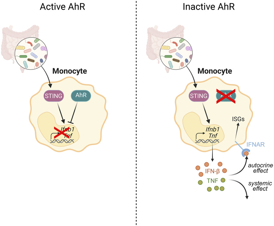 Immune cells are constantly exposed to microbiota-derived compounds that can engage innate recognition receptors. How this constitutive stimulation is downmodulated to avoid systemic inflammation and autoimmunity is poorly understood. Here, we show that aryl hydrocarbon receptor (AhR) deficiency in monocytes unleashed spontaneous cytokine responses in vivo, driven by stimulator of interferon genes (STING)-mediated tonic sensing of microbiota. This effect was specific to monocytes, as mice deficient for AhR specifically in macrophages did not show any dysregulation of tonic cytokine responses. AhR inhibition also increased tonic cytokine production in human monocytes. Finally, in patients with systemic juvenile idiopathic arthritis, low AhR activity in monocytes correlated with elevated cytokine responses. Our findings reveal an essential role for AhR in monocytes in restraining tonic microbiota sensing and in maintaining immune homeostasis.