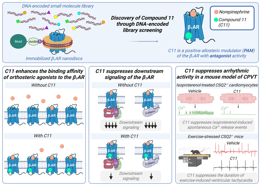 Orthosteric beta blockers represent the leading pharmacological intervention for managing heart diseases owing to their ability to competitively antagonize β-adrenergic receptors (βARs). However, their use is often limited by adverse effects such as fatigue, hypotension, and reduced exercise capacity, due in part to nonselective inhibition of multiple βAR subtypes. These challenges are particularly problematic in treating catecholaminergic polymorphic ventricular tachycardia (CPVT), a disease characterized by lethal tachyarrhythmias directly triggered by cardiac β1AR activation. To identify small-molecule allosteric modulators of the β1AR with enhanced subtype specificity and robust functional antagonism of β1AR-mediated signaling, we conducted a DNA-encoded small-molecule library screen and discovered Compound 11 (C11). C11 selectively potentiates the binding affinity of orthosteric agonists to the β1AR while potently inhibiting downstream signaling after β1AR activation. C11 prevents agonist-induced spontaneous contractile activity, Ca2+ release events, and exercise-induced ventricular tachycardia in the CSQ2–/– murine model of CPVT. Our studies demonstrate that C11 belongs to an emerging class of allosteric modulators termed positive allosteric modulator antagonists that positively modulate agonist binding but block downstream function. Its pharmacological properties and selective functional antagonism of β1AR-mediated signaling make C11 a promising therapeutic candidate for the treatment of CPVT and other forms of cardiac disease associated with excessive β1AR activation.