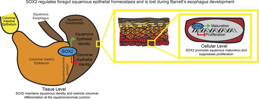 Esophageal adenocarcinoma is increasingly prevalent and is thought to arise from Barrett’s esophagus (BE), a metaplastic condition in which chronic acid and bile reflux transforms the esophageal squamous epithelium into a gastric-intestinal glandular mucosa. The molecular determinants driving this metaplasia are poorly understood. We developed a human BE organoid biobank that recapitulates BE’s molecular heterogeneity. Bulk and single-cell transcriptomics, supported by patient tissue analysis, revealed that BE differentiation reflects a balance between SOX2 (foregut/esophageal) and CDX2 (hindgut/intestinal) transcription factors. Using squamous-specific inducible Sox2-KO (Krt5CreER/+ Sox2Δ/Δ ROSA26tdTomato/+) mice, we observed increased basal proliferation, reduced squamous differentiation, and expanded metaplastic glands at the squamocolumnar junction, some tracing back to Krt5-expressing cells. CUT&RUN analysis showed SOX2 bound and promoted differentiation-associated targets (e.g., Krt13) and repressed proliferation-associated targets (e.g., Mki67). Thus, SOX2 is critical for foregut squamous epithelial differentiation, and its decreased expression is likely an initiating step in progression to BE and then to esophageal adenocarcinoma.