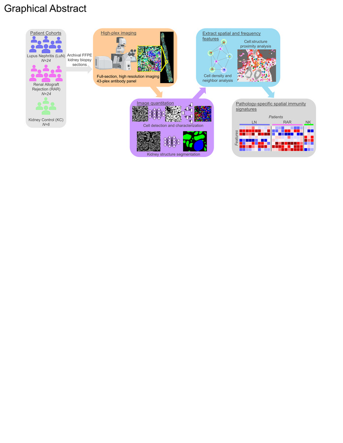 BACKGROUND. In human lupus nephritis (LuN), tubulointerstitial inflammation (TII) is prognostically more important than glomerular inflammation. However, a comprehensive understanding of both TII complexity and heterogeneity is lacking. METHODS. Herein, we used high-dimensional confocal microscopy, spatial transcriptomics and specialized computer vision techniques to quantify immune cell populations and localize these within normal and diseased renal cortex structures. With these tools, we compared LuN to renal allograft rejection (RAR) and normal kidney on 54 de-identified biopsies. RESULTS. In both LuN and RAR, the 33 characterized immune cell populations formed discrete subgroups whose constituents co-varied in prevalence across biopsies. In both diseases, these co-variant immune cell subgroups organized into the same unique niches. Therefore, inflammation could be resolved into trajectories representing the relative prevalence and density of cardinal immune cell members of each co-variant subgroup. Indeed, in any one biopsy, the inflammatory state could be characterized by quantifying constituent immune cell trajectories. Remarkably, LuN heterogeneity could be captured by quantifying a few myeloid immune cell trajectories while RAR was more complex with additional T cell trajectories. CONCLUSIONS. Our studies identify rules governing renal inflammation and thus provide an approach for resolving LuN into discrete mechanistic categories. FUNDING. NIH (U19 AI 082724 [MRC], R01 AI148705 [MRC and ASC]), Chan Zuckerberg Biohub (MRC) and Lupus Research Alliance (MRC)