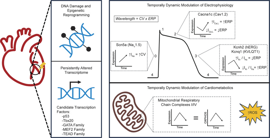 Stereotactic arrhythmia radiotherapy (STAR) is emerging as a highly effective treatment for ventricular tachycardia (VT). Growing evidence indicates that STAR favorably reprograms the electrical substrate by speeding conduction and/or prolonging repolarization via modulation of ion channel expression, although the mechanisms by which single-fraction radiation mediates durable changes in gene expression are incompletely understood. Here, we identify dynamic changes in the cardiomyocyte epigenome and transcriptome after irradiation (IR) in vivo and in vitro, including durably increased expression and chromatin accessibility of Scn5a (encodes the α subunit of the sodium channel, NaV1.5), demonstrating a role for epigenetic memory in conduction velocity (CV) increases observed after STAR. Transcriptomic and epigenetic sequencing further identified dynamic changes in gene expression and regulatory regions involved in cellular repolarization, calcium handling, and metabolism after IR. These changes were mirrored by dose-dependent and cell-autonomous changes in repolarization, calcium flux, and mitochondrial respiration, highlighting important cellular processes that may mediate the therapeutic effects of STAR. Overall, we found that cardiomyocytes exposed to a single fraction of high-dose IR exhibited epigenetic reprogramming that mediated broad and dynamic physiologic responses.