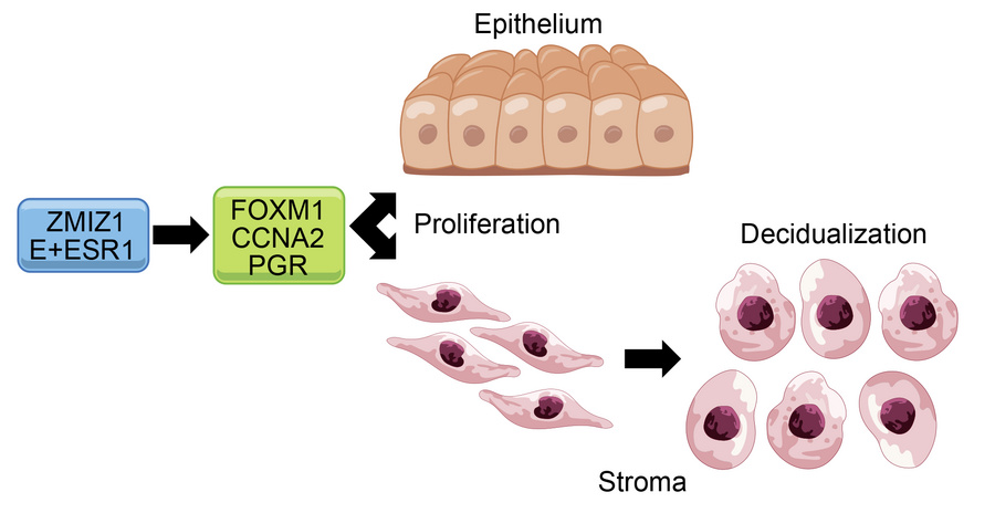 Estrogen is a critical regulator of endometrial health. Aberrant estrogen stimulation can result in infertility, endometrial cancer, and endometriosis. Here, we identified Zinc Finger MIZ-Type Containing 1 (Zmiz1) as a coregulator of uterine estrogen signaling. ZMIZ1 is colocalized with an estrogen receptor α–binding (ESR1-binding) super enhancer. ZMIZ1 mutations are found in endometrial cancer and its RNA levels trend toward reduction in endometrium of patients with endometriosis. ZMIZ1 is dynamically expressed in human endometrial tissues during the menstrual cycle. Disrupting ZMIZ1 in cultured human endometrial stromal cells resulted in impaired cell proliferation and decidual differentiation. Ablation of Zmiz1 using the PgrCre mouse (Zmiz1d/d) resulted in infertility and accelerated age-dependent uterine fibrosis. Zmiz1d/d mice showed reduced ovulation and progesterone levels while maintaining normal serum prolactin during pregnancy. Uteri of Zmiz1d/d mice were unable to undergo a hormonally induced decidual response, had decreased expression of stromal progesterone receptor (PGR) and decreased stromal and epithelial cell proliferation. Analysis of the transcriptome of Zmiz1d/d mouse uteri showed decreased E2F, CCNA2, and FOXM1 signaling. Challenging ovariectomized Zmiz1d/d mice with estrogen resulted in a decreased amplitude of some estrogen-regulated gene responses. Our findings demonstrate the importance of ZMIZ1 as an ESR1 coregulator in uterine biology and pathology.