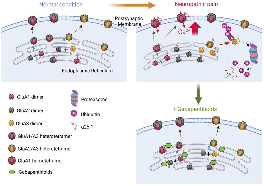 Spinal α2δ-1 induces GluA3 degradation to regulate assembly of calcium-permeable AMPA receptors and pain hypersensitivity