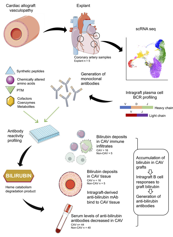 BACKGROUND Cardiac allograft vasculopathy (CAV) is consistently accompanied by immune infiltrates surrounding affected coronary arteries, including antibody-producing plasma cells (PC). The antigenic drivers of these intragraft PC responses remain poorly defined.METHODS We characterized graft infiltrating PC by single-cell RNA sequencing and immunoglobulin gene profiling. Using immunoglobulin sequences, we generated 37 recombinant monoclonal antibodies (mAb) from dominant intragraft PC clones and 24 control mAb from peripheral blood PC. Antigen reactivity was screened against chemical adducts, including bilirubin, a heme-degradation byproduct. Histologic and tissue analyses assessed bilirubin deposition as well as expression of hemecatabolic enzymes and the presence of Fe2+ in heart explants with CAV.RESULTS A majority of graft-derived mAb (21 of 37; approximately 57%) — but none of the mAb derived from blood PC — reacted to bilirubin. Bilirubin deposition was detected within lymphocytic aggregates in CAV grafts. In coronary arteries with CAV lesions, bilirubin accumulated in the cytoplasm and nuclei of smooth muscle cells in the tunica media, a pattern not observed in healthy heart tissue. Lastly, we detected the expression of heme-oxygenase-1 and biliverdin reductases in graft-infiltrating macrophages along with the presence of Fe2+ ion in the media of arteries with hyperplasia.CONCLUSION These findings suggest that local heme catabolism and resultant bilirubin accumulation create a prominent target for intragraft antibody responses in CAV. Bilirubin-specific antibodies and hemecatabolic pathways may contribute to CAV pathogenesis and represent potential mechanistic and therapeutic avenues for further investigation.FUNDING Grants AI116814, AI154845, AI184963, and AI176507, HL148528, RYC2022-036797-I, P30CA013696, UL1TR001873, S10OD020056.