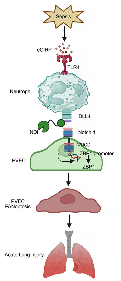 Neutrophils play a critical role in sepsis-induced acute lung injury (ALI). Extracellular cold-inducible RNA-binding protein (eCIRP), a damage-associated molecular pattern, promotes neutrophil heterogeneity. While delta-like ligand 4 (DLL4) expression has been studied in various cell populations, its expression in neutrophils and impact on inflammation remain unknown. Here, we discovered that eCIRP induces DLL4+ neutrophils. These neutrophils trigger PANoptosis, a novel proinflammatory form of cell death initiated by Z-DNA–binding protein-1 (ZBP1) in pulmonary vascular endothelial cells (PVECs). In sepsis, DLL4+ neutrophils increase in the blood and lungs, upregulating ZBP1, cleaved gasdermin D, cleaved caspase-3, and phosphorylated MLKL, all of which are markers of PANoptosis, exacerbating ALI. DLL4 binds to Notch1 on PVECs and activates Notch1 intracellular domain to increase ZBP1-mediated endothelial PANoptosis. We discovered what we believe to be a novel Notch1-DLL4 inhibitor (NDI), derived from Notch1 to specifically block this interaction. Our findings reveal that NDI reduced endothelial PANoptosis in vitro and in vivo, attenuated pulmonary injury induced by DLL4+ neutrophils, and decreased lung water content and permeability, indicating improved barrier function. NDI also reduced serum injury and inflammatory markers and improved survival rate in sepsis. These findings underscore the Notch1-DLL4 pathway’s critical role in DLL4+ neutrophil–mediated ALI. Targeting the Notch1-DLL4 interaction with an NDI represents a promising therapeutic strategy for sepsis-induced ALI.