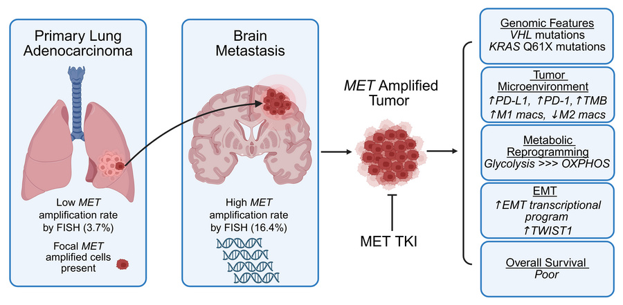 Non–small cell lung cancer exhibits the highest rates of brain metastases (BMs) among all solid tumors, presenting a major clinical challenge. The development of novel therapeutic strategies targeting BMs is clearly needed. We identified a significant enrichment of MET amplification in lung adenocarcinoma (LUAD) BMs compared with primary LUAD and extracranial metastases in oncogene driver–negative patients. Of note, MET-amplified BMs were responsive to MET inhibitors in vivo, including models with acquired MET amplification at the time of metastasis. MET alterations (amplifications and/or mutations) were also more frequently detected in circulating tumor DNA from patients with LUAD BMs than in those without BMs. MET-altered BMs also demonstrated unique genomic features compared with non–MET-altered BMs. Transcriptomic analyses revealed that in contrast to MET WT BMs, MET-amplified BMs exhibited a more inflamed tumor microenvironment and displayed evidence of metabolic adaptation, particularly a reliance on glycolysis in contrast to OXPHOS in MET WT BMs. Furthermore, MET-amplified BMs demonstrated evidence of epithelial-mesenchymal transition signaling, including increased expression of TWIST1. Patients with MET-amplified BMs had significantly shorter overall survival. These findings highlight MET amplification as a critical driver of LUAD BMs, emphasizing its potential as a therapeutic target.