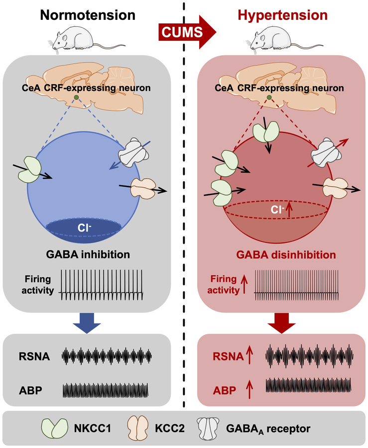 Stress promotes the progression from borderline hypertension to sustained hypertension, but the mechanism remains unclear. We investigated the role of corticotropin-releasing factor (CRF)-expressing neurons in the central nucleus of amygdala (CeA) on arterial blood pressure (ABP) and sympathetic activity of borderline hypertensive rats (BHRs) subjected to chronic unpredictable mild stress (CUMS). CUMS induced sustained hypertension, and led to increased delta-FosB expression as well as enhanced spontaneous and evoked firing of CeA CRF-expressing neurons in BHRs. Furthermore, optogenetic activation of CeA CRF-expressing neurons significantly increased the sympathetic outflow and ABP in BHRs. Impaired GABAergic inhibition, a depolarizing shift of GABA reversal potential (EGABA), disrupted chloride homeostasis and increased NKCC1 expression were observed in CeA CRF-expressing neurons in BHRs subjected to CUMS. NKCC1 inhibition with bumetanide restored GABAergic inhibition and chloride homeostasis, normalized neuronal excitability, leading to reduced sympathetic vasomotor tone in CUMS BHRs. These results indicate that NKCC1-mediated disruption of chloride homeostasis in CeA CRF-expressing neurons contributes to elevated sympathetic activity and hypertension under chronic stress. These findings enhance our understanding of the neuronal and molecular mechanisms underlying stress-induced hypertension and reveal potential targets for its prevention and treatment.