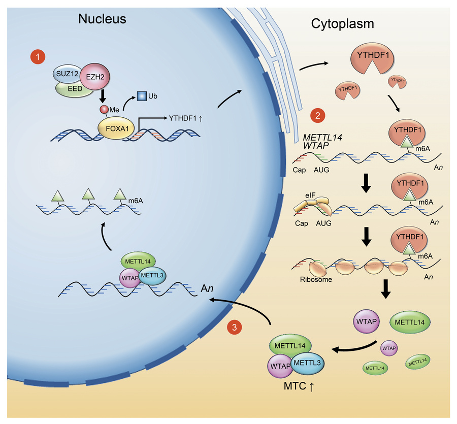 N6-methyladenosine (m6A), the most predominant RNA modification in humans, participates in various fundamental and pathological bioprocesses. Dynamic manipulation of m6A deposition in the transcriptome is critical for cancer progression, though how this regulation is achieved remains understudied. Here, we report that, in prostate cancer (PCa), Polycomb group (PcG) protein Enhancer of Zeste Homolog 2 (EZH2) exerts an additional function in m6A regulation via its enzymatic activity. Mechanistically, EZH2 methylates and stabilizes FOXA1 proteins from degradation, which, in turn, facilitates the transcription of m6A reader YTHDF1. Through activating an m6A autoregulation pathway, YTHDF1 enhances the translation of METTL14 and WTAP, 2 critical components of the m6A methyltransferase complex (MTC), and thereby upregulates the global m6A level in PCa cells. We further demonstrate that inhibiting the catalytic activity of EZH2 suppresses the translation process globally through targeting the YTHDF1-m6A axis. By disrupting both the expression and interaction of key m6A MTC subunits, combinational treatment of EZH2 degrader MS8815 and m6A inhibitor STM2457 mitigates prostate tumor growth synergistically. Together, our study decodes a previously hidden interrelationship between EZH2 and mRNA modification, which may be leveraged to advance the EZH2-targeting curative strategies in cancer.
