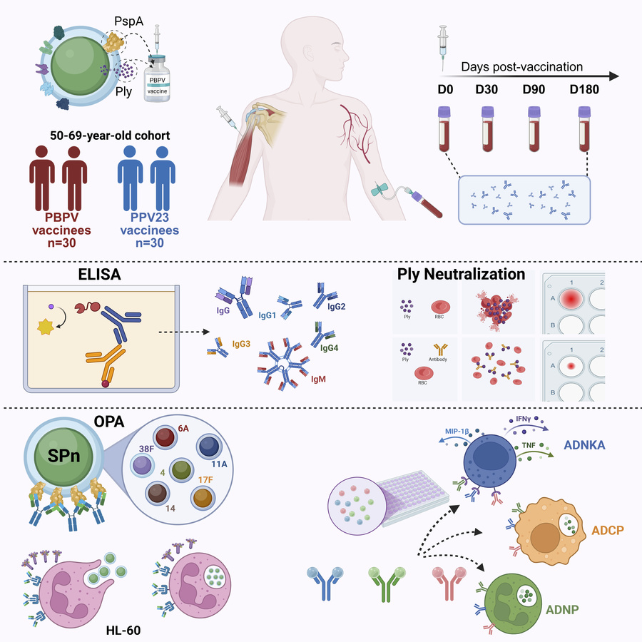 Traditional polysaccharide vaccines are constrained by streptococcus pneumoniae diversity. We propose a protein-based pneumococcal vaccine (PBPV) — formulated with conserved surface proteins P3296, P5668, PRx1, and pneumolysin (Ply) — that could potentially offer superior immune breadth independent of capsular polysaccharide serotypes. Here, we evaluated the multifunctional antibody responses induced by PBPV, including immunogenicity, Ply neutralization, opsonophagocytic activity (OPA), and such nonopsonic functions as NK cell activation (ADNKA), antibody-dependent cellular phagocytosis, and neutrophil phagocytosis (ADNP) in a cohort of 50- to 69-year-olds. While PBPV showed shorter-lasting immune responses, including reduced Ply-neutralizing capacity, it provided broader cross-serotype protection than 23-valent pneumococcal polysaccharide vaccine. Correlation analysis identified distinct PspA-specific IgG subclass roles: P3296-IgG1 correlated with OPA, and IgG3 correlated with ADNKA/ADNP; P5668-IgG2 correlated with ADNKA/ADNP, and IgG3 correlated with OPA; and PRx1-IgG2 correlated with OPA, and IgG3 correlated with ADNKA. Critically, while no efficacy data have yet confirmed the protective effect of PBPV, its targeting of conserved proteins rather than capsular polysaccharides enables simplified manufacturing and expanded coverage, positioning it as a promising alternative to traditional multipolysaccharide vaccines.