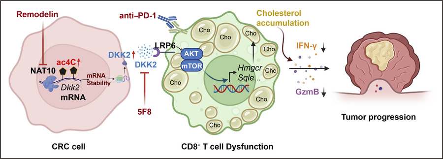 Despite overexpression of N-acetyltransferase 10 (NAT10) in colorectal cancer (CRC), its immunomodulatory role in the tumor microenvironment remains elusive. Here, we reveal that NAT10 promotes immune evasion through N4-acetylcytosine–dependent (ac4C-dependent) mRNA stabilization. Using syngeneic mouse models (MC38/CT-26), intestinal epithelial-cell specific Nat10 conditional KO (Nat10cKO) mice, patient-derived organoids, and clinical specimens, we show that Nat10 ablation enhanced CD8+ T cell–mediated antitumor immunity. Single-cell RNA-seq revealed increased cytotoxic CD8+ T cell infiltration in Nat10cKO tumors, which was corroborated by the inverse correlation of tumoral NAT10 expression and CD8+ T cell number in clinical specimens. Multi-omics integration analysis identified DKK2 as the predominant NAT10-regulated transcript. NAT10 stabilized DKK2 mRNA via ac4C modification, leading to high expression of the DKK2 protein. Secreted DKK2 engaged LRP6 receptors to activate AKT-mTOR signaling, inducing cholesterol accumulation in CD8+ T cells and impairing their cytotoxicity. Pharmacological NAT10 inhibition (Remodelin treatment) or DKK2 neutralization restored CD8+ T cell function and synergized with anti–PD-1 therapy. Our findings establish the NAT10/DKK2/LRP6/AKT-mTOR/cholesterol axis as a critical regulator of CD8+ T cell dysfunction in CRC, positioning NAT10/DKK2 as a potential target to enhance immunotherapy efficacy.
