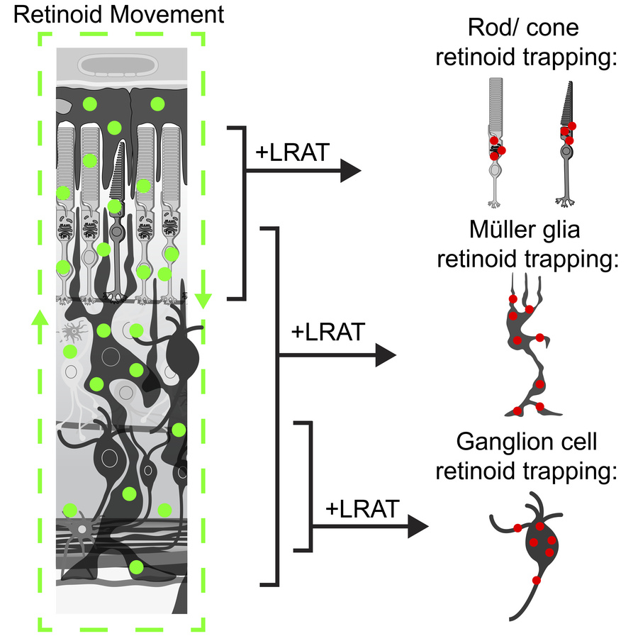 11-cis-Retinal is essential for light perception in mammalian photoreceptors (PRs), and aberrations in retinoid transformations cause severe retinal diseases. Understanding these processes is crucial for combating blinding diseases. The visual cycle, operating within PRs and the retinal pigment epithelium (RPE), regenerates 11-cis-retinal to sustain light sensitivity. Retinoids are also present in Müller glia (MG), hypothesized to supply 11-cis-retinol to cone PRs and retinal ganglion cells (RGCs). To trace retinoid movement through retinal cell types, we used cell-specific knockin of lecithin:retinol acyltransferase (LRAT), which converts retinols into stable retinyl esters (REs). Ectopic LRAT expression in murine PRs, MG, and RGCs resulted in RE synthesis, with REs differing in abundance and isomeric composition across cell types under genetic and light-based perturbations. PR inner segments showed high 11-cis-RE content, suggesting a constant 11-cis-retinoid supply for pigment regeneration. In MG expressing LRAT, all-trans-REs were detected, contrasting with 11-cis-REs in PRs. The MG-specific LRAT phenotype mirrored the RE-rich human neural retina, suggesting human MG may utilize LRAT to maintain retinoid reservoirs. Our findings reveal tightly controlled retinoid flux throughout the mammalian retina that supports sustained vision, expanding understanding of the visual cycle to combat retinal diseases.